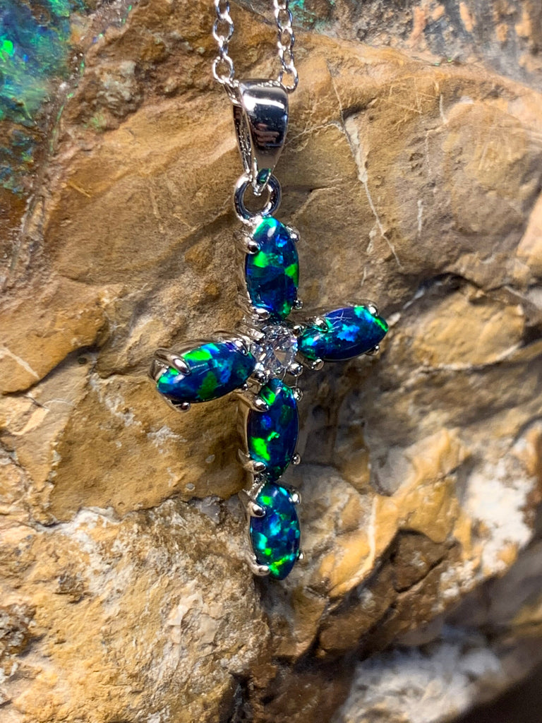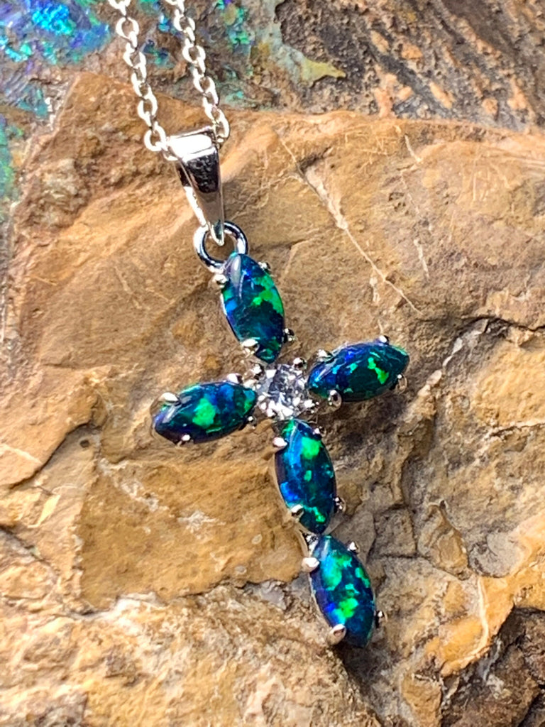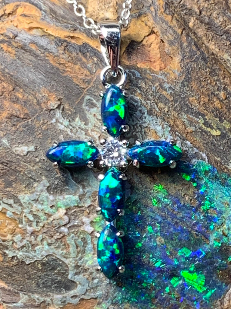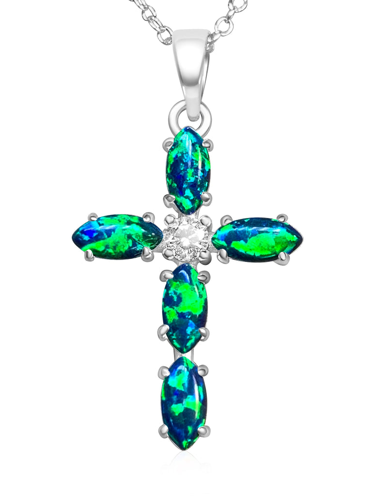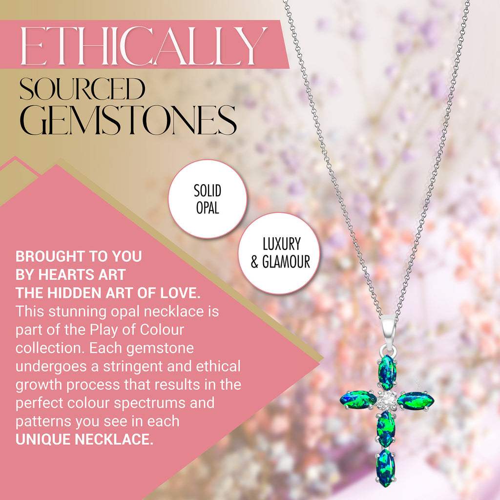 Heart's Art Australia- Play of Colour - Sterling Silver Classic Cross pendant Created 6x4mm Solid Green Black Opal - Great Gift for women!