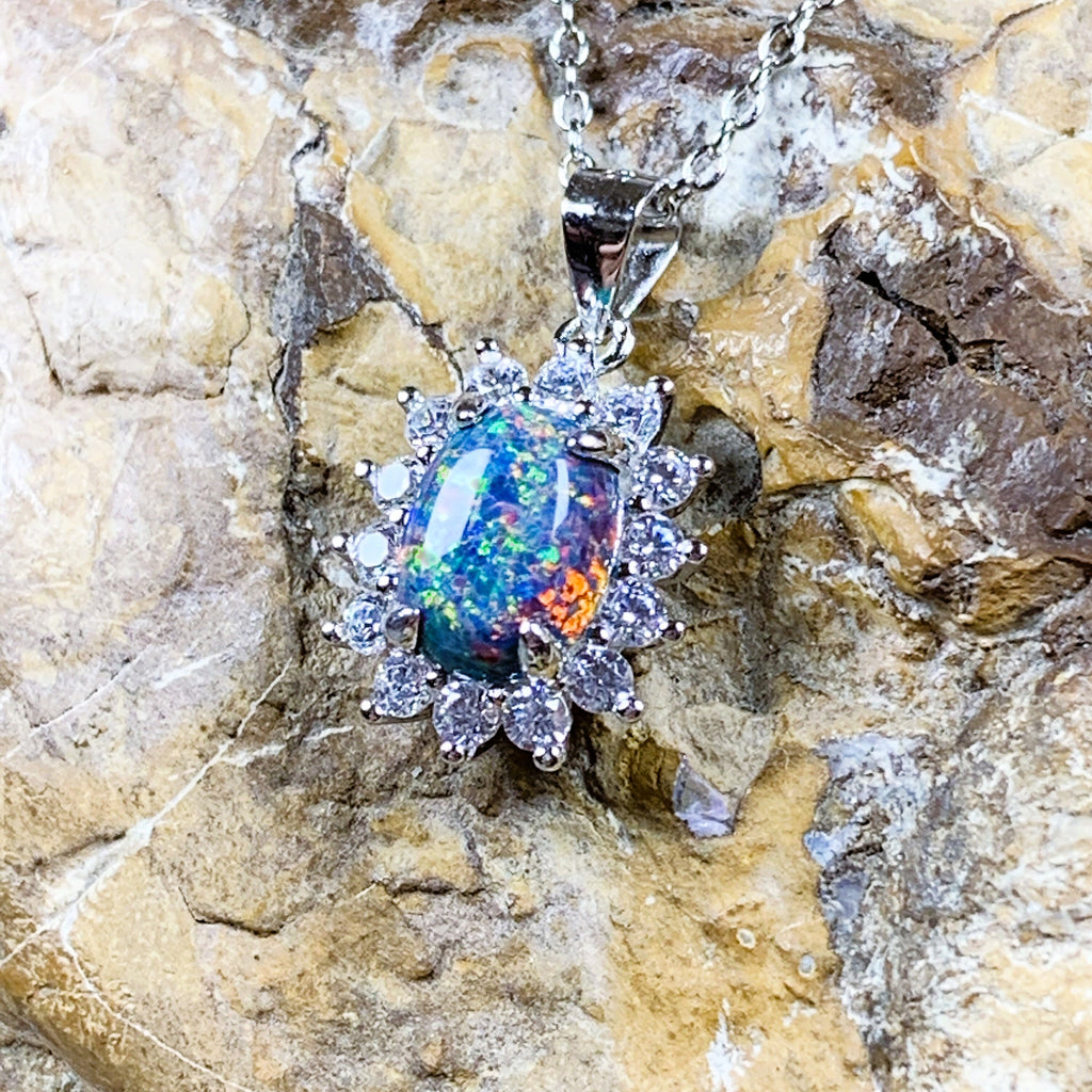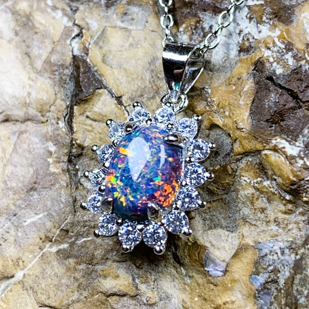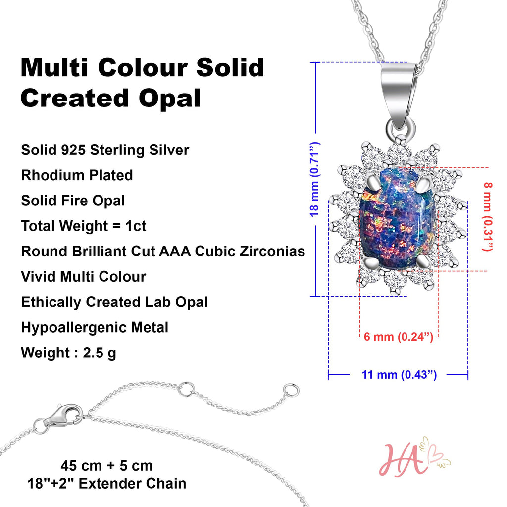 Heart's Art Australia- Play of Colour - Sterling Silver Cluster Created 8x6mm Solid Black Blue Red Fire Opal pendant- Gift for women