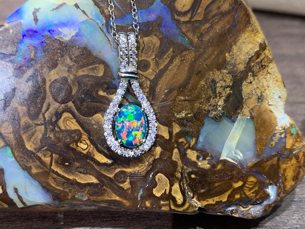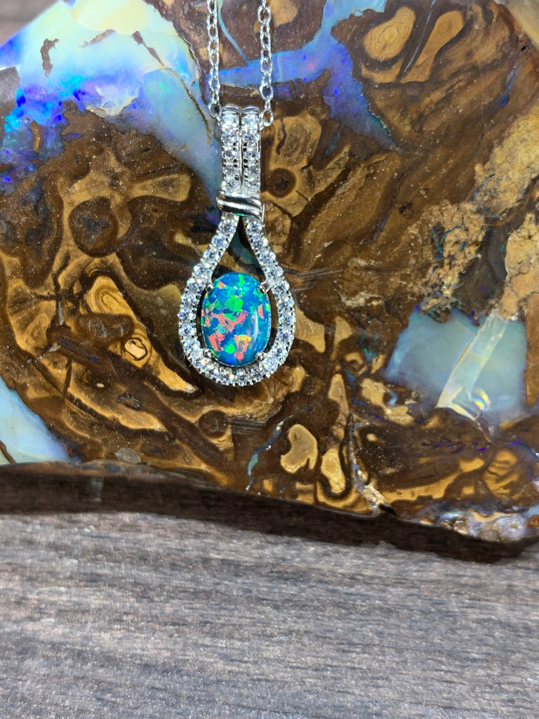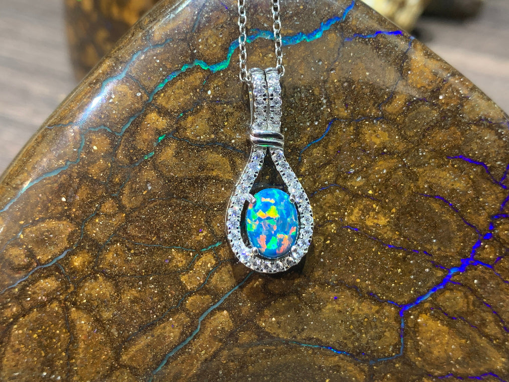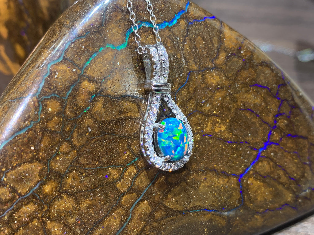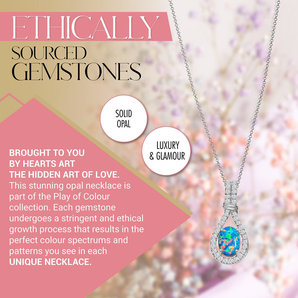 Heart's Art Australia- Play of Colour - Sterling Silver Halo cluster Created 8x6mm Solid Teal Blue Green Opal pendant- Great Gift for women!