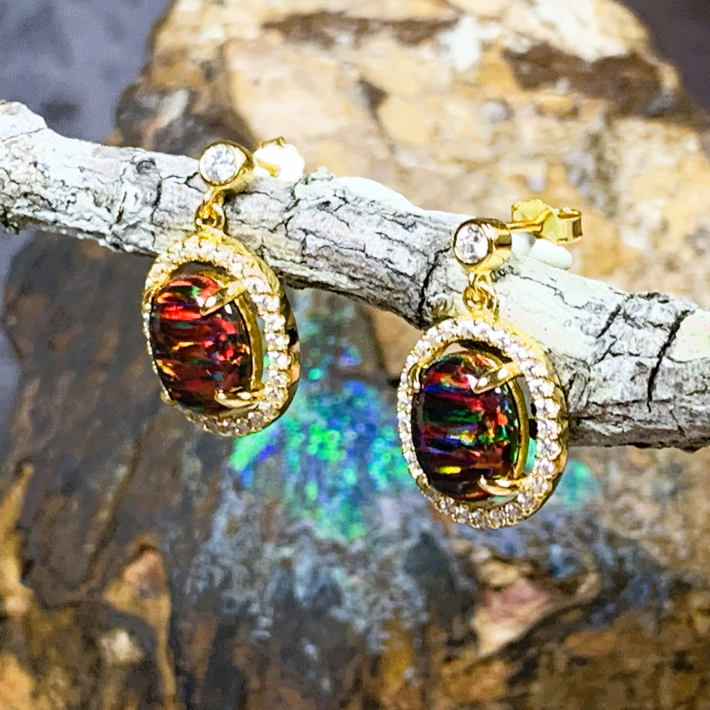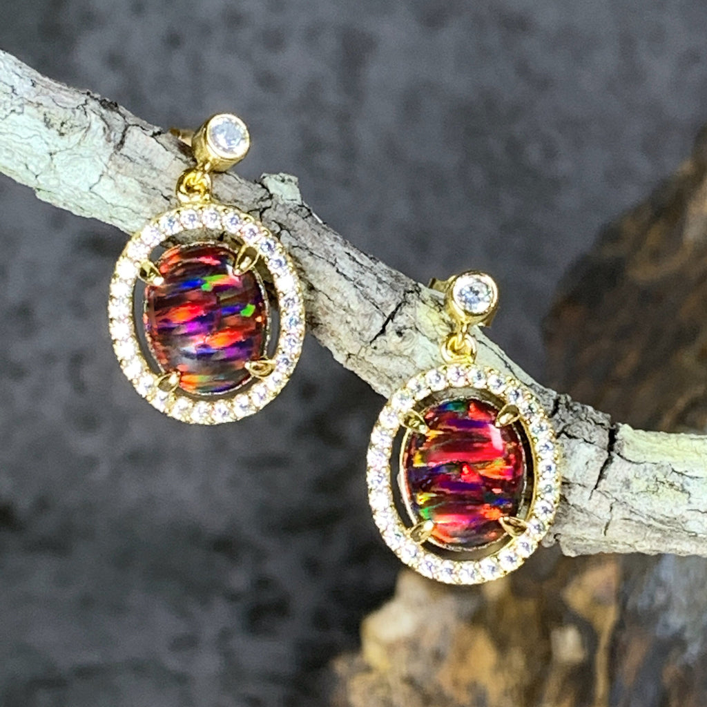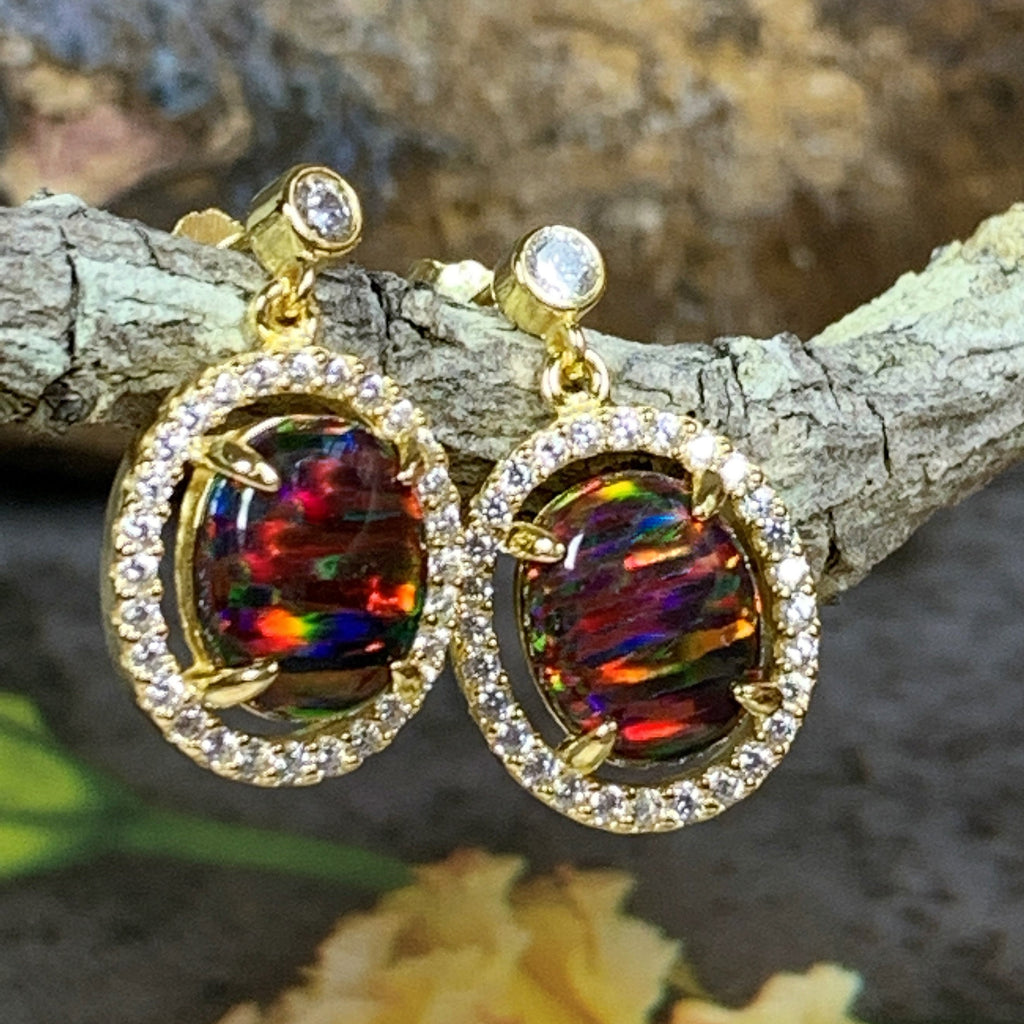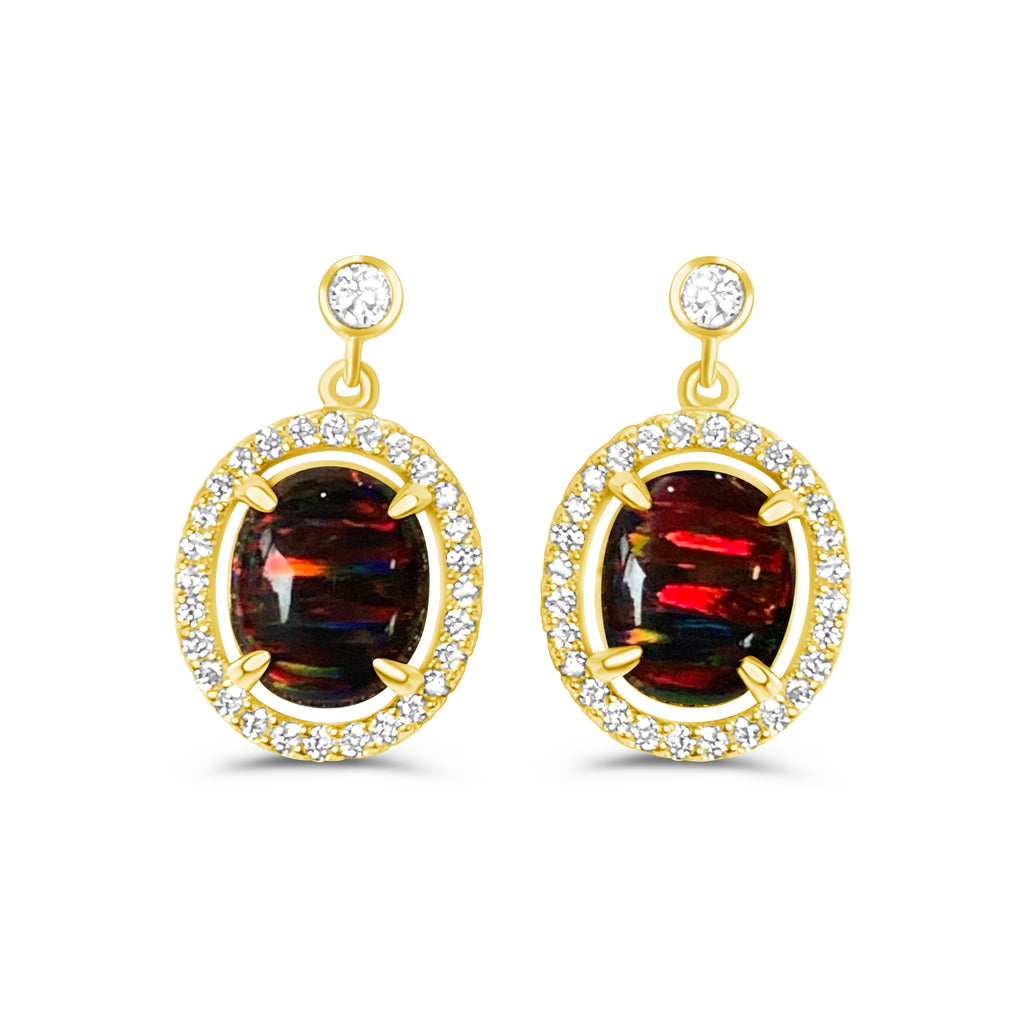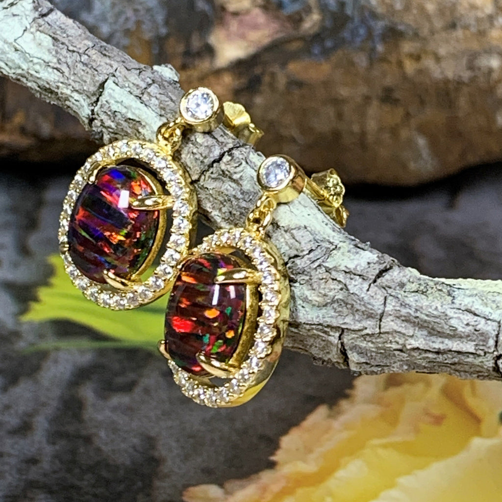 Heart's Art Australia 18kt Yellow Gold over Sterling Silver Created 10x8mm Solid Black Fire Opal Halo dangling earrings Great Gift for women