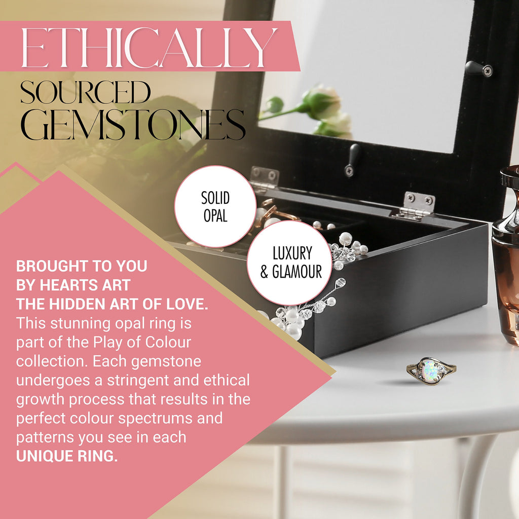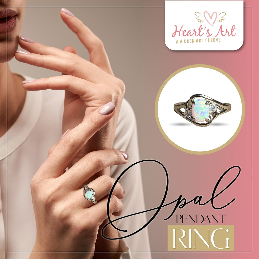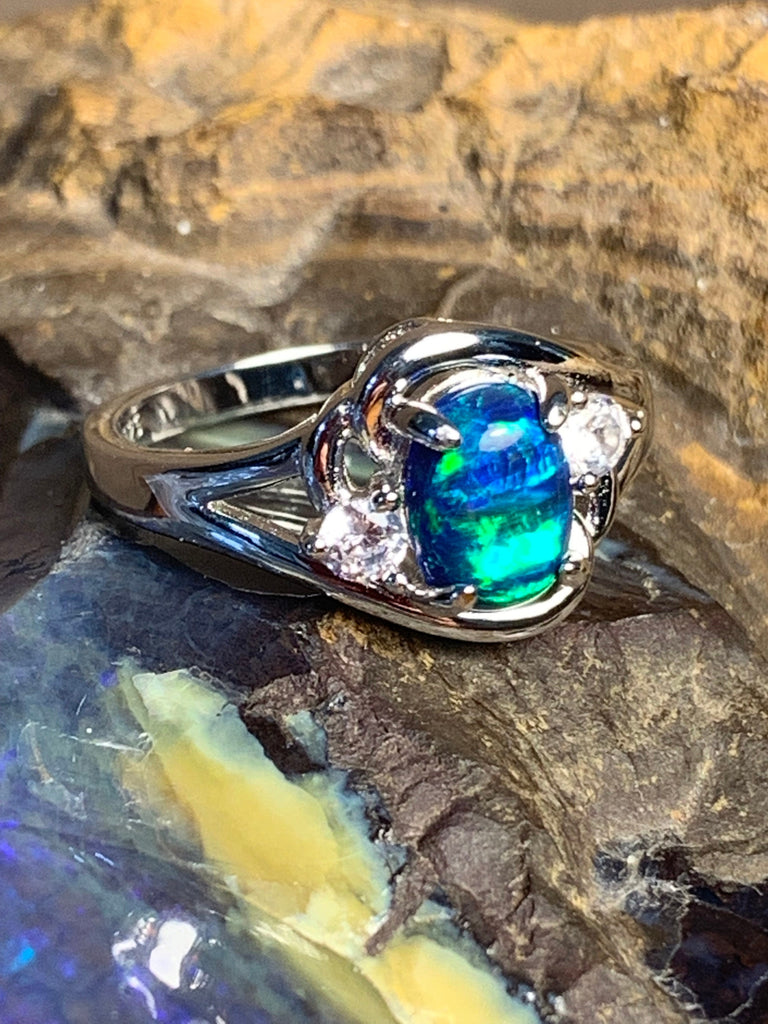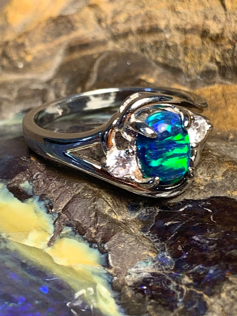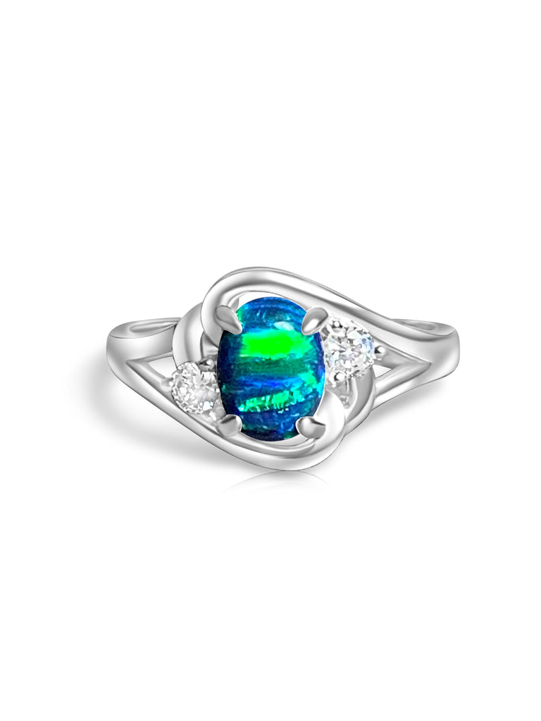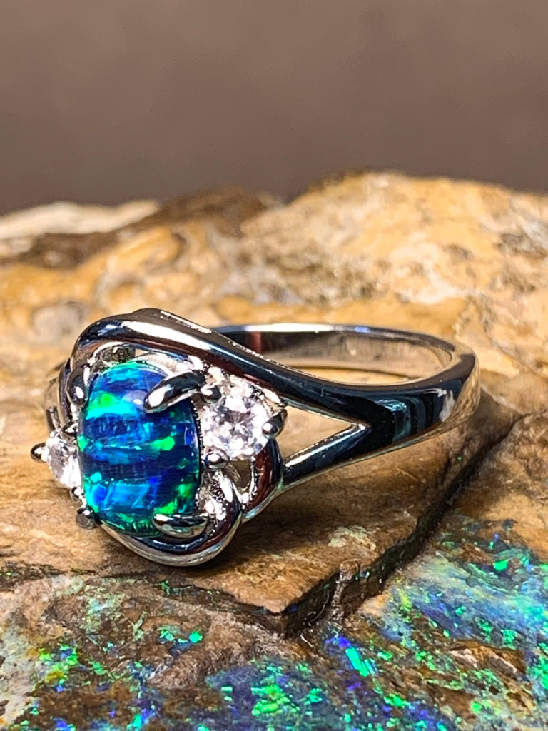 Heart's Art Australia- Play of Colour - Sterling Silver Created 8x6mm Marine Green Blue Opal cross over ring- Beautiful rings for women
