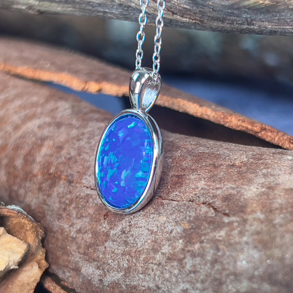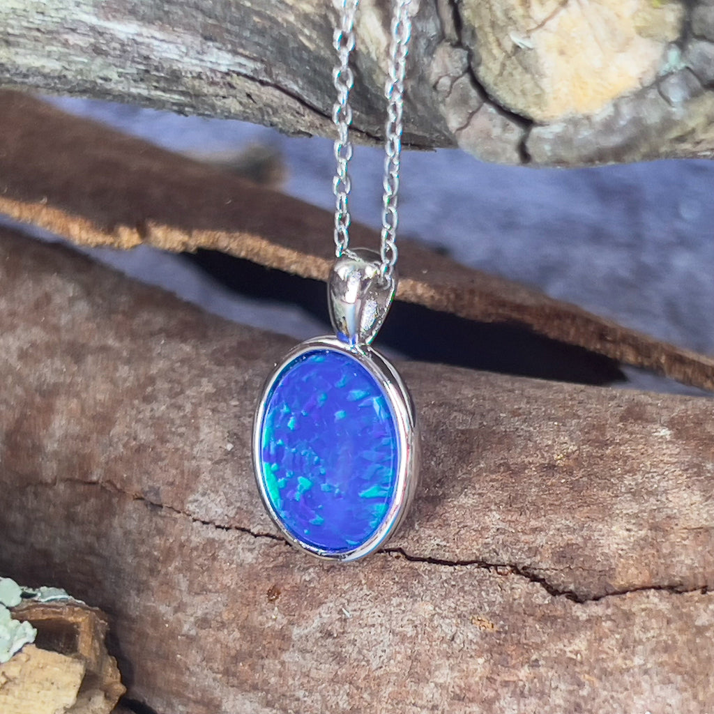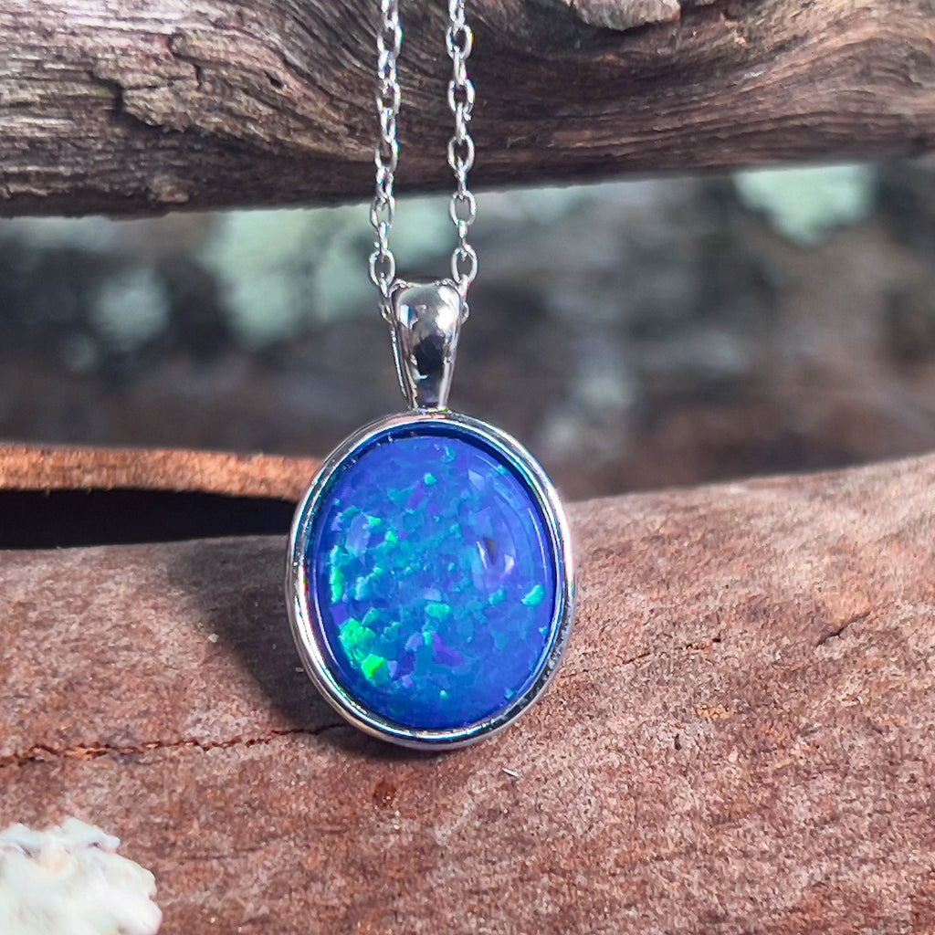 Hearts Art Australia- Silver Necklace with 12x10mm Fire Blue Created Opal - Large Minimalist Jewelry, Gift for Her, Women's Opal Necklace