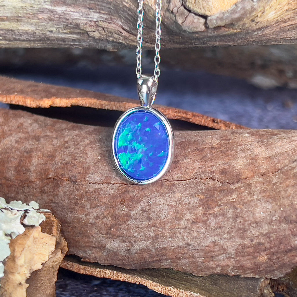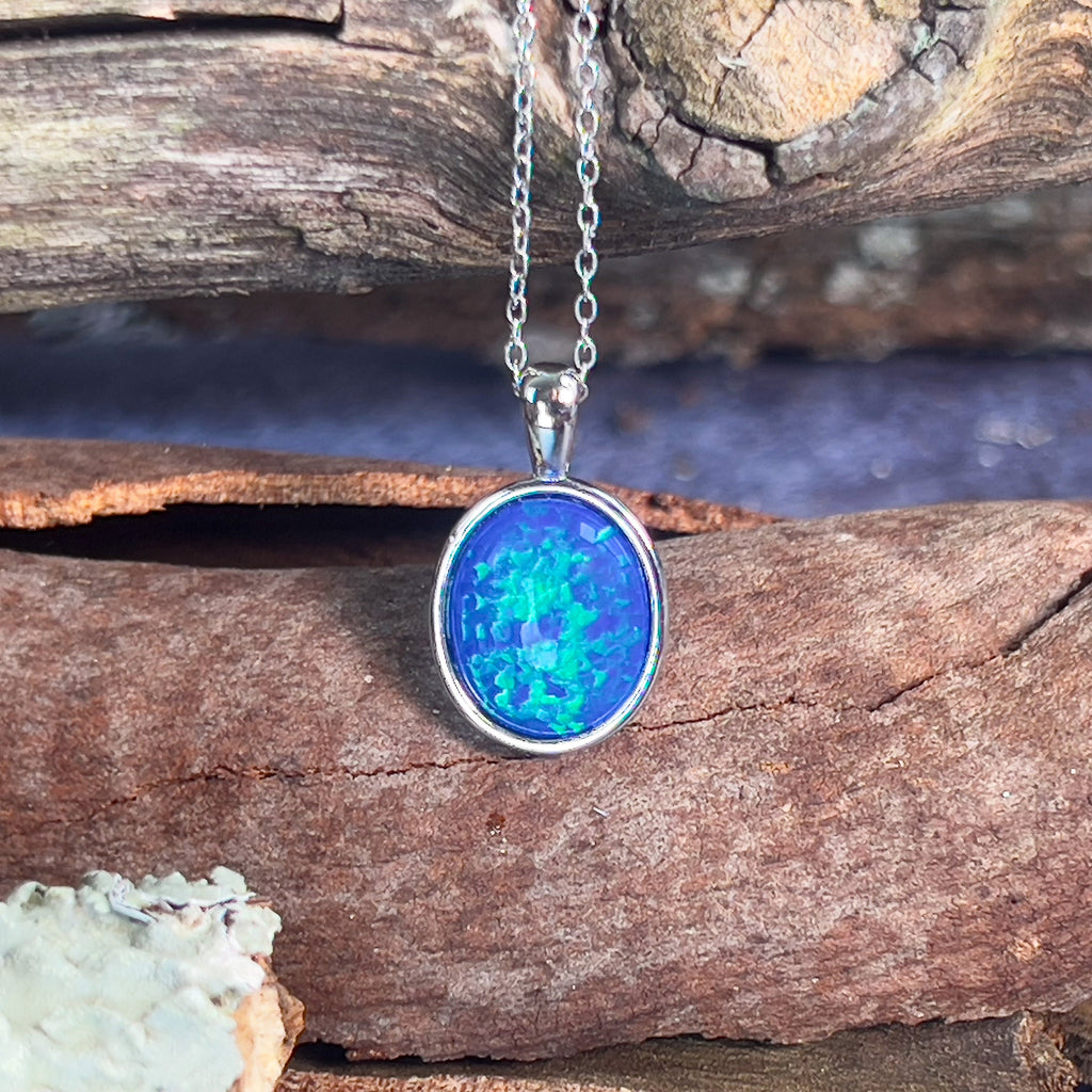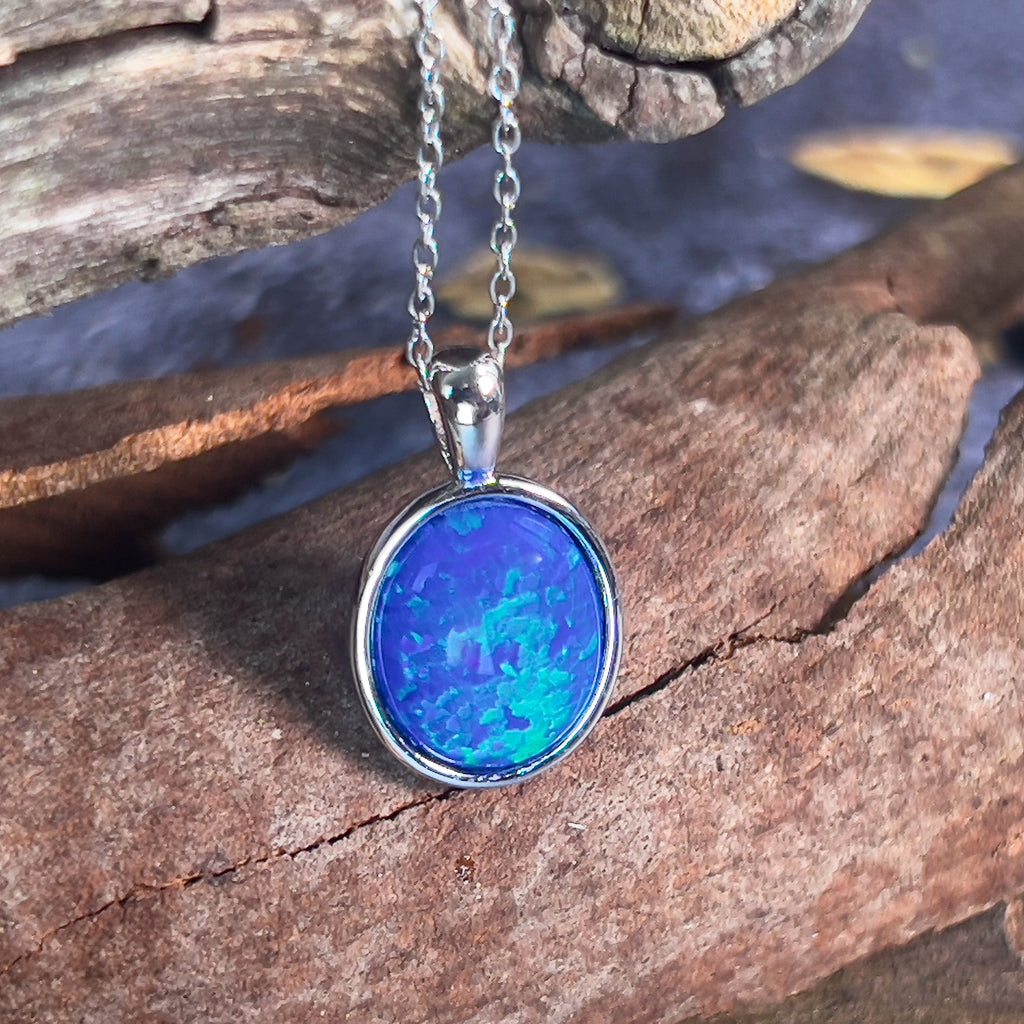 Hearts Art Australia- Silver Necklace with 12x10mm Fire Blue Created Opal - Large Minimalist Jewelry, Gift for Her, Women's Opal Necklace