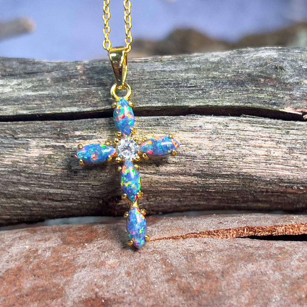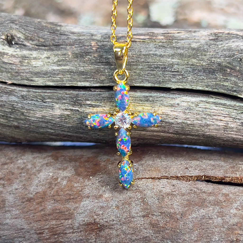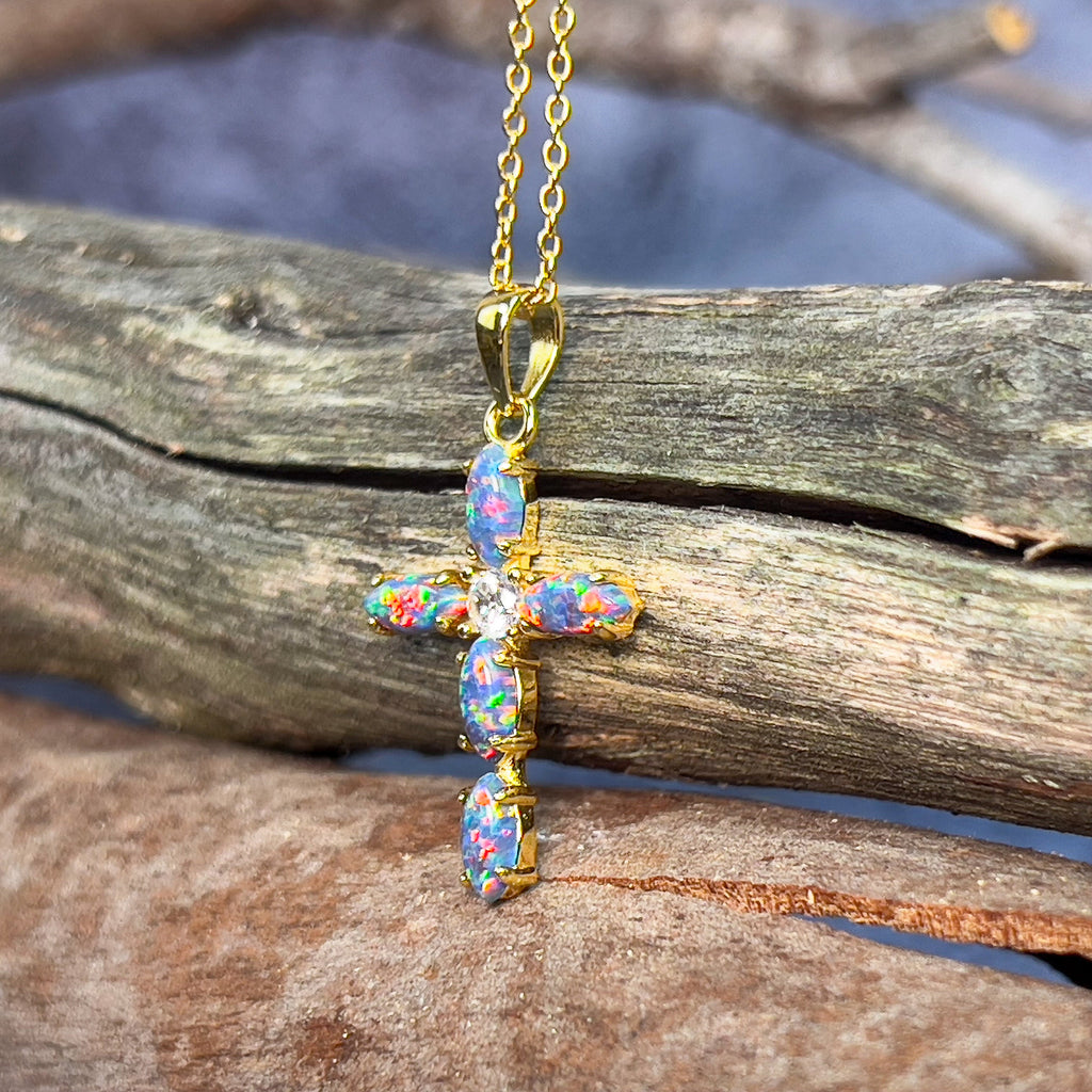 Play of Colour- Sterling Silver Gold Plated Classic Cross pendant Created 6x4mm Solid Multi Red Black Opal- Great Gift for women!