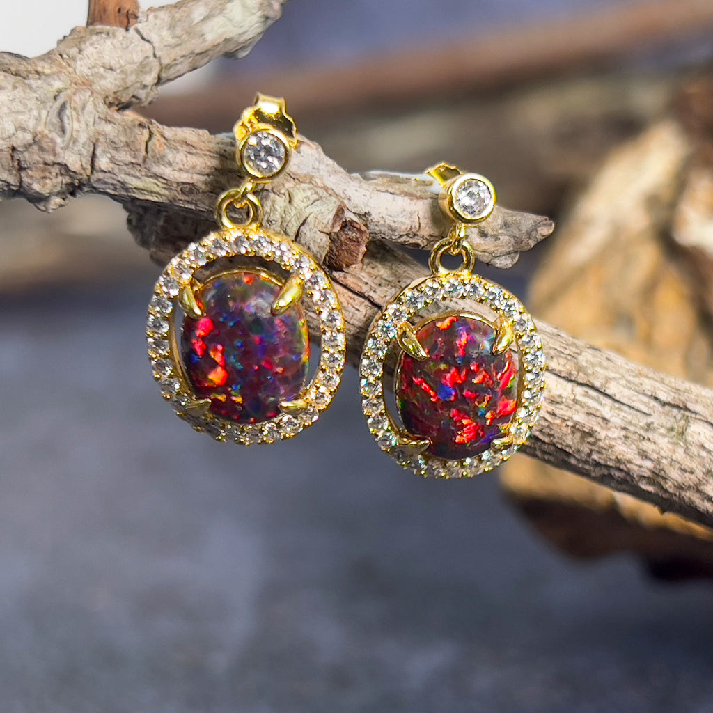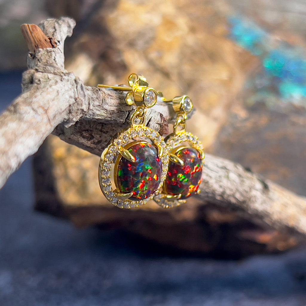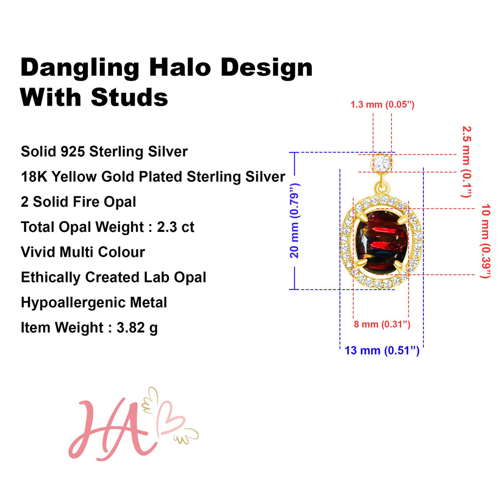 Heart's Art Australia 18kt Yellow Gold over Sterling Silver Created 10x8mm Solid Black Fire Opal Halo dangling earrings Great Gift for women