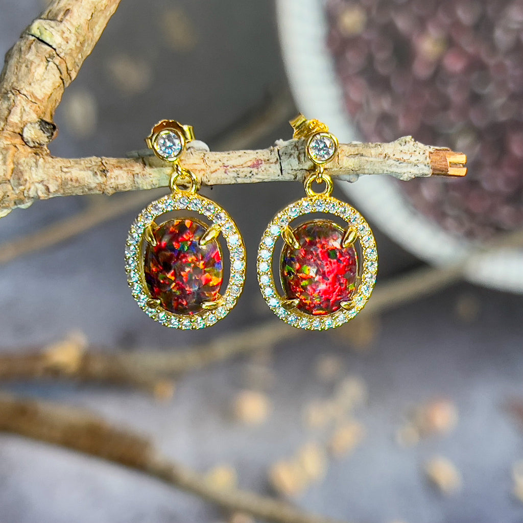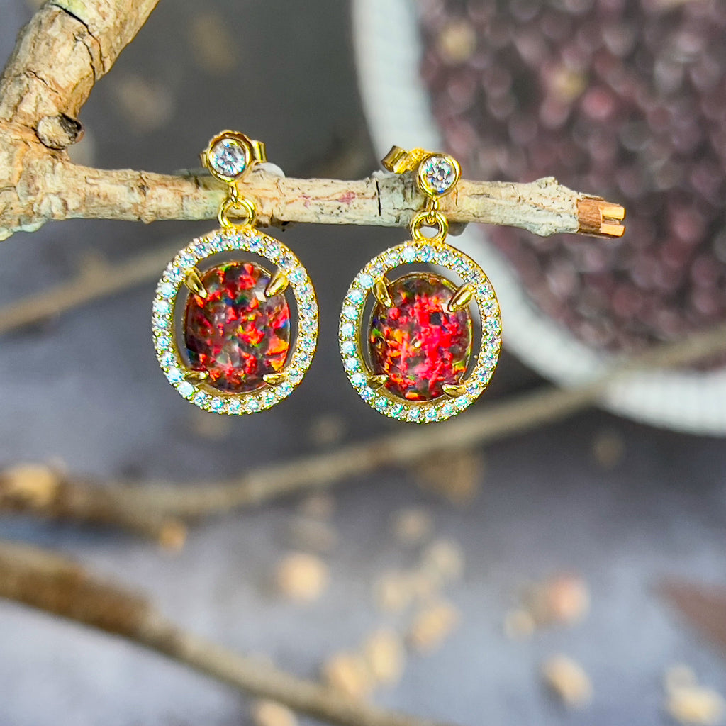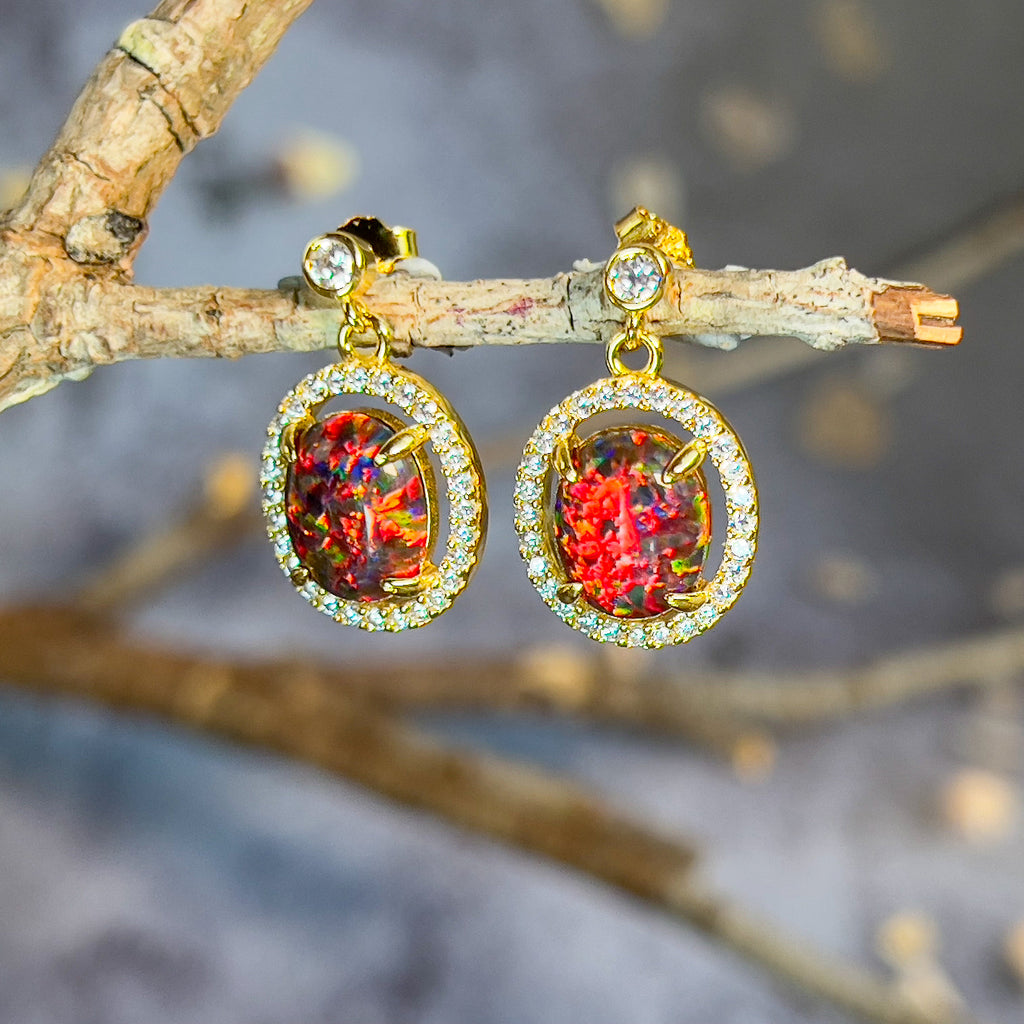 Heart's Art Australia 18kt Yellow Gold over Sterling Silver Created 10x8mm Solid Black Fire Opal Halo dangling earrings Great Gift for women