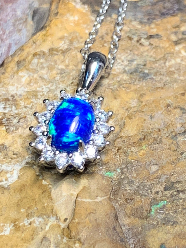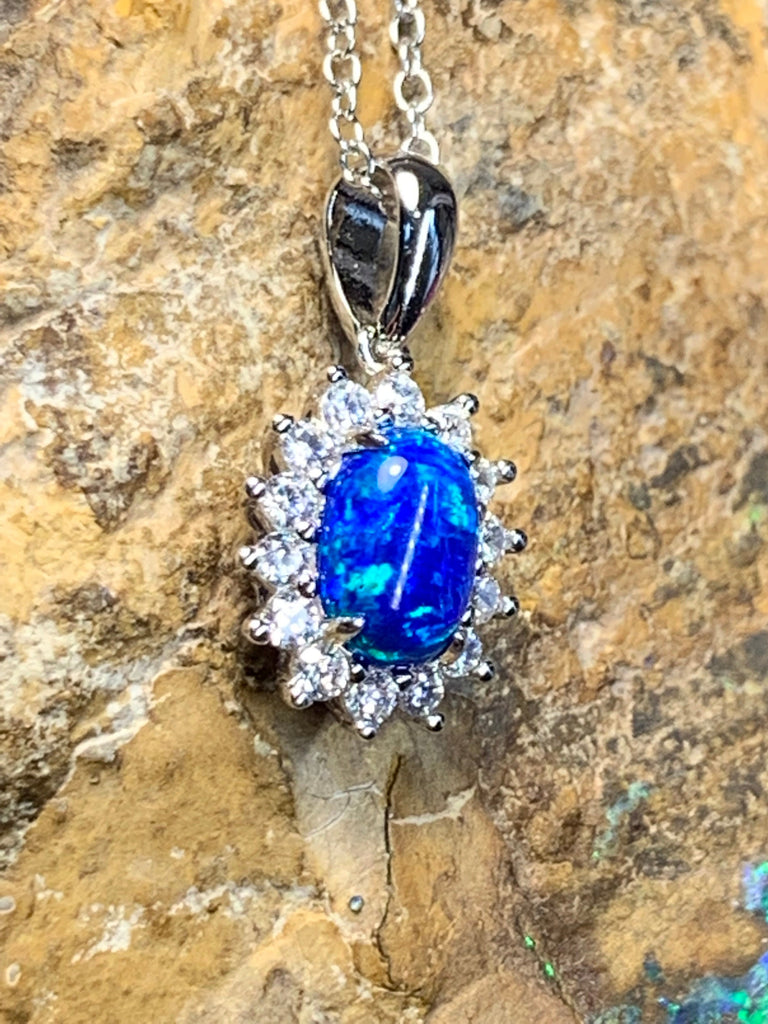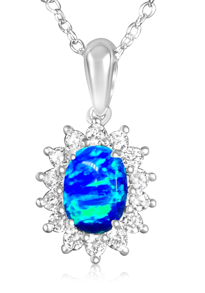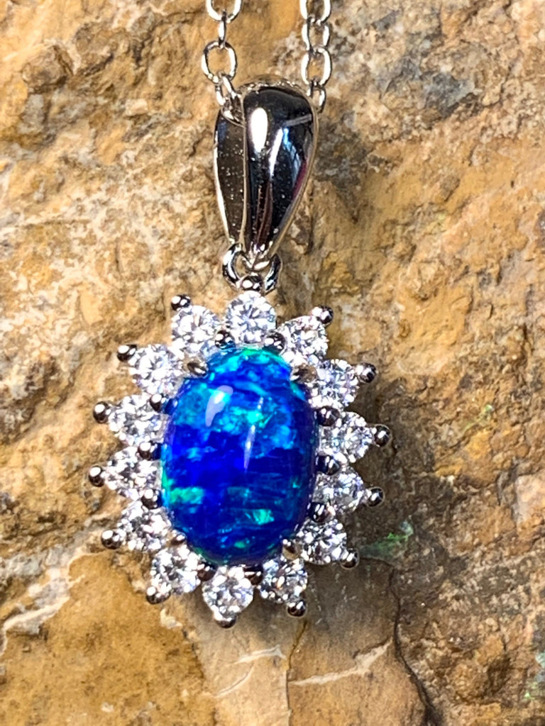 Heart's Art Australia- Play of Colour- Sterling Silver Classic cluster Created 7x5mm Solid Lake Green Blue Opal pendant- Gift for women
