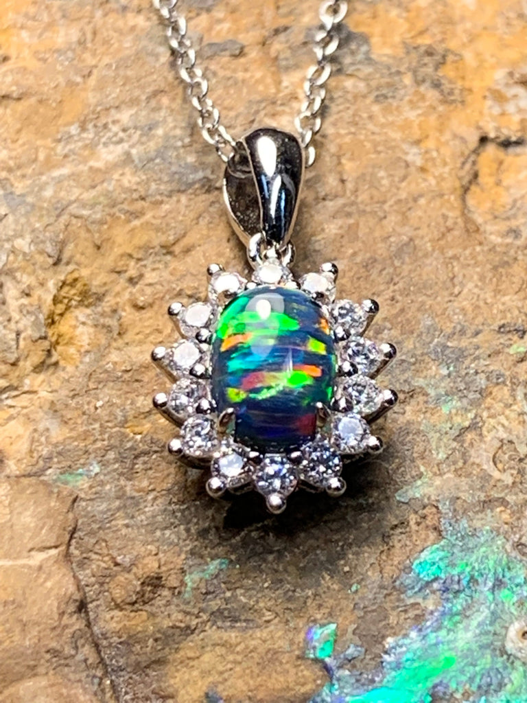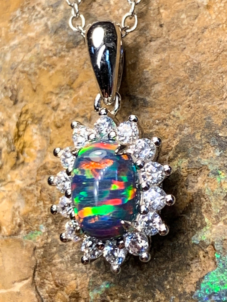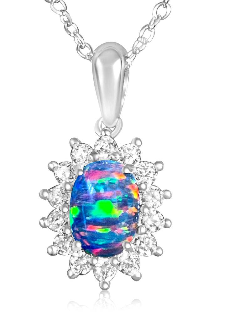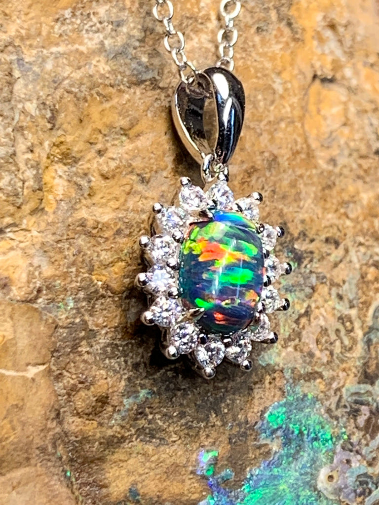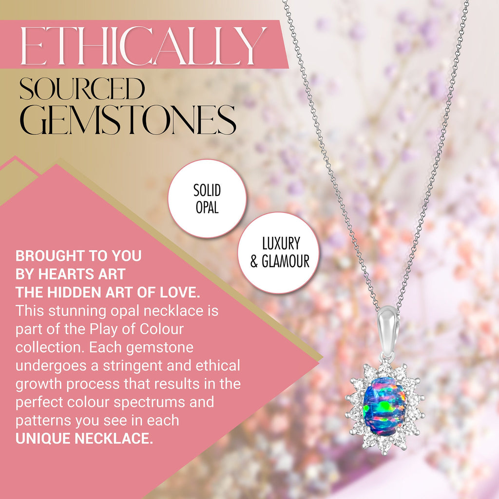 Heart's Art Australia- Play of Colour - Sterling Silver Classic cluster Created 7x5mm Solid Space Blue Red Opal pendant- Gift for women