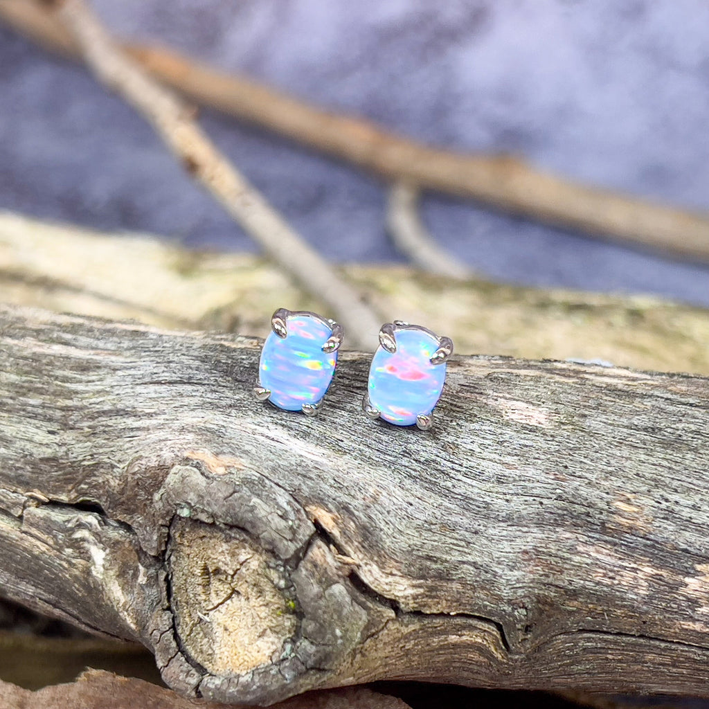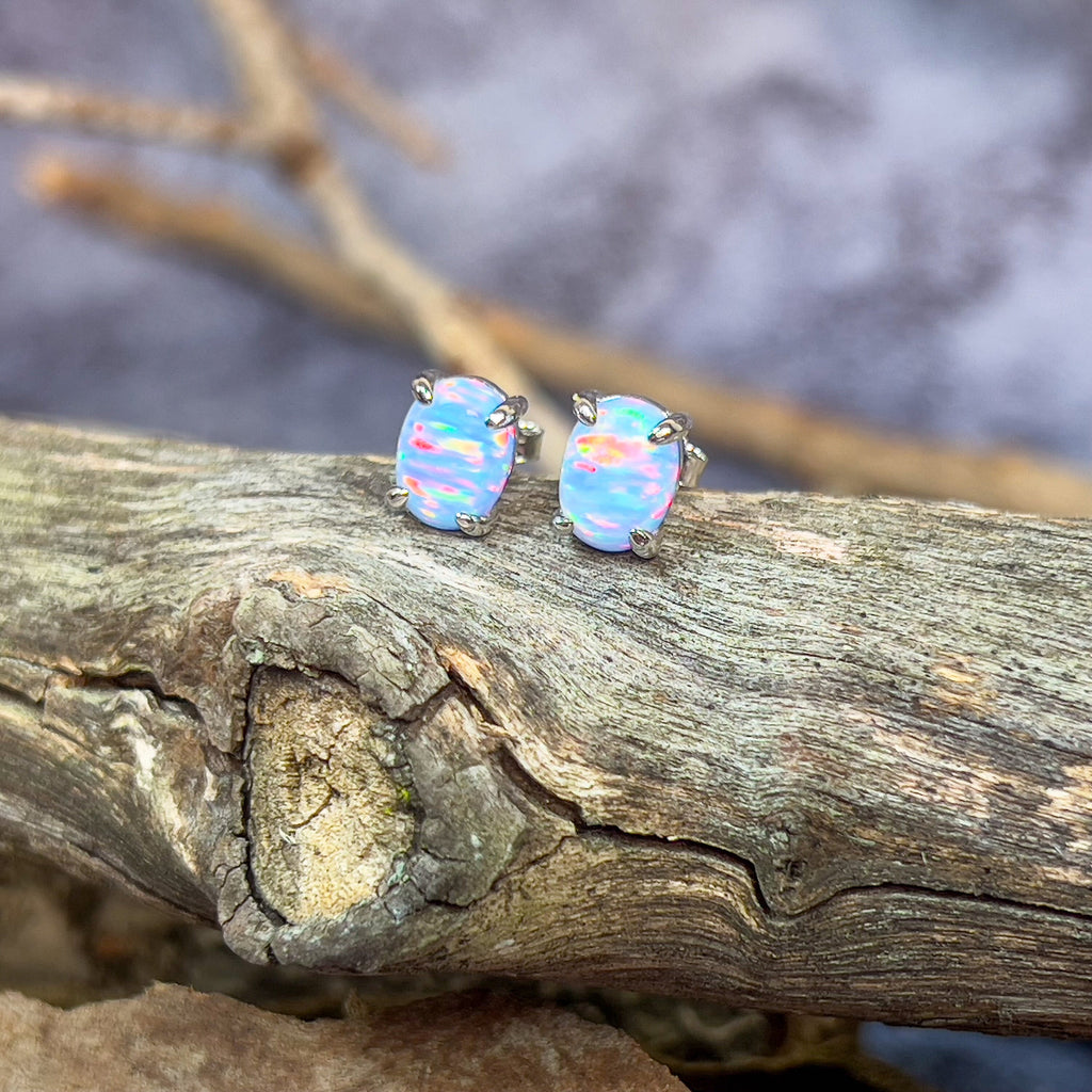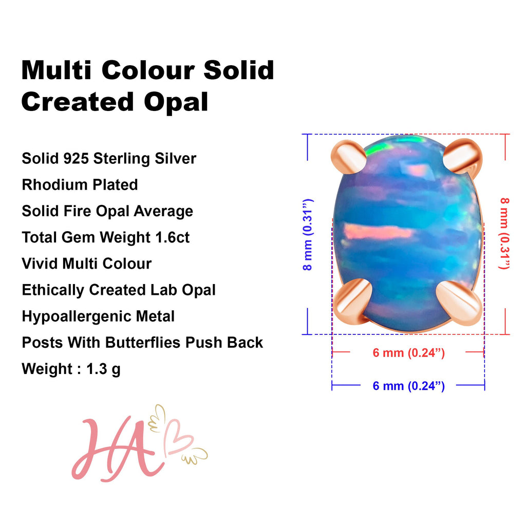 Heart's Art Australia- Play of Colour- Sterling Silver Created 8x6mm Solid Light Blue Red Opal stud earrings- Great Gift for everyday wear!