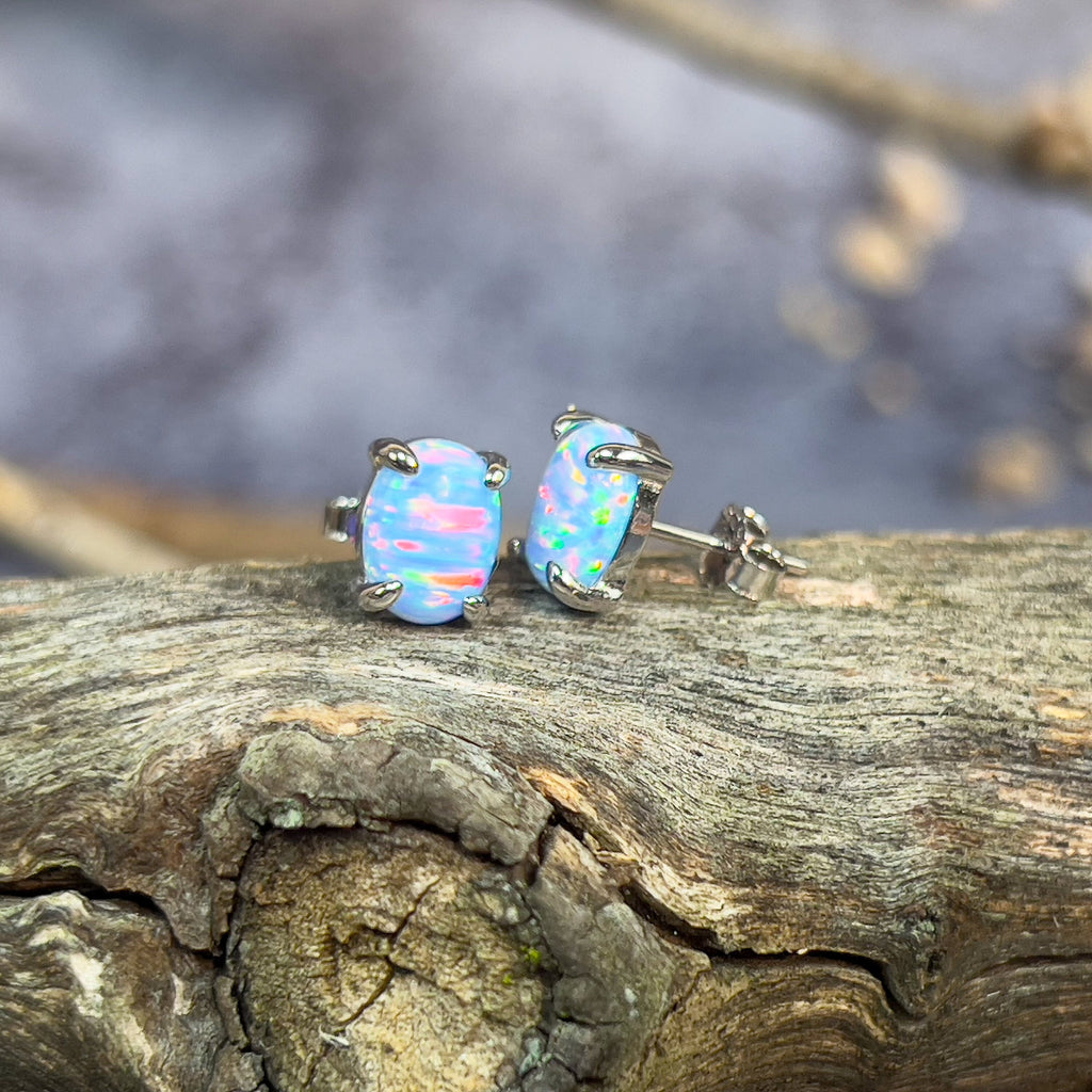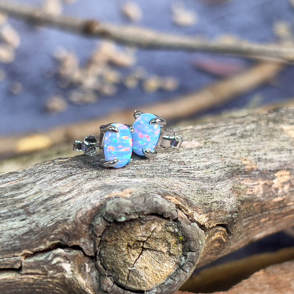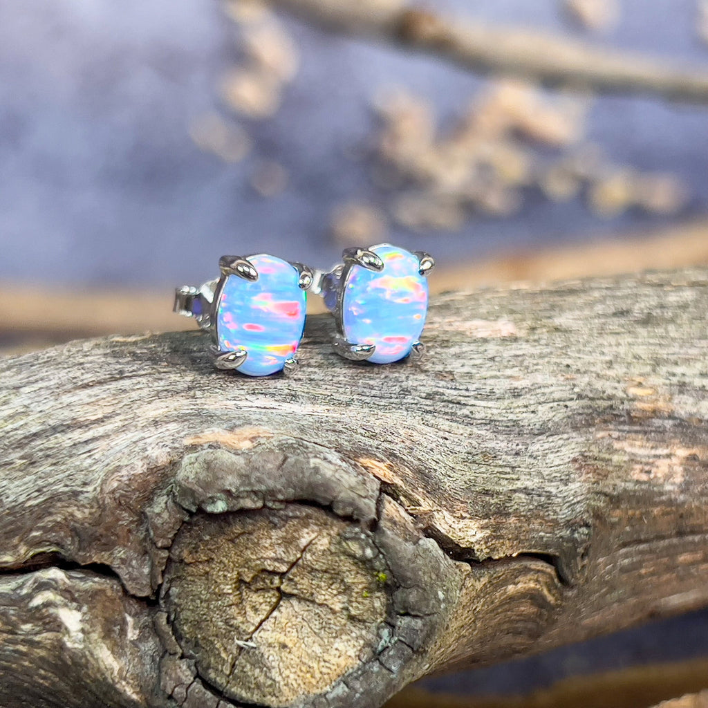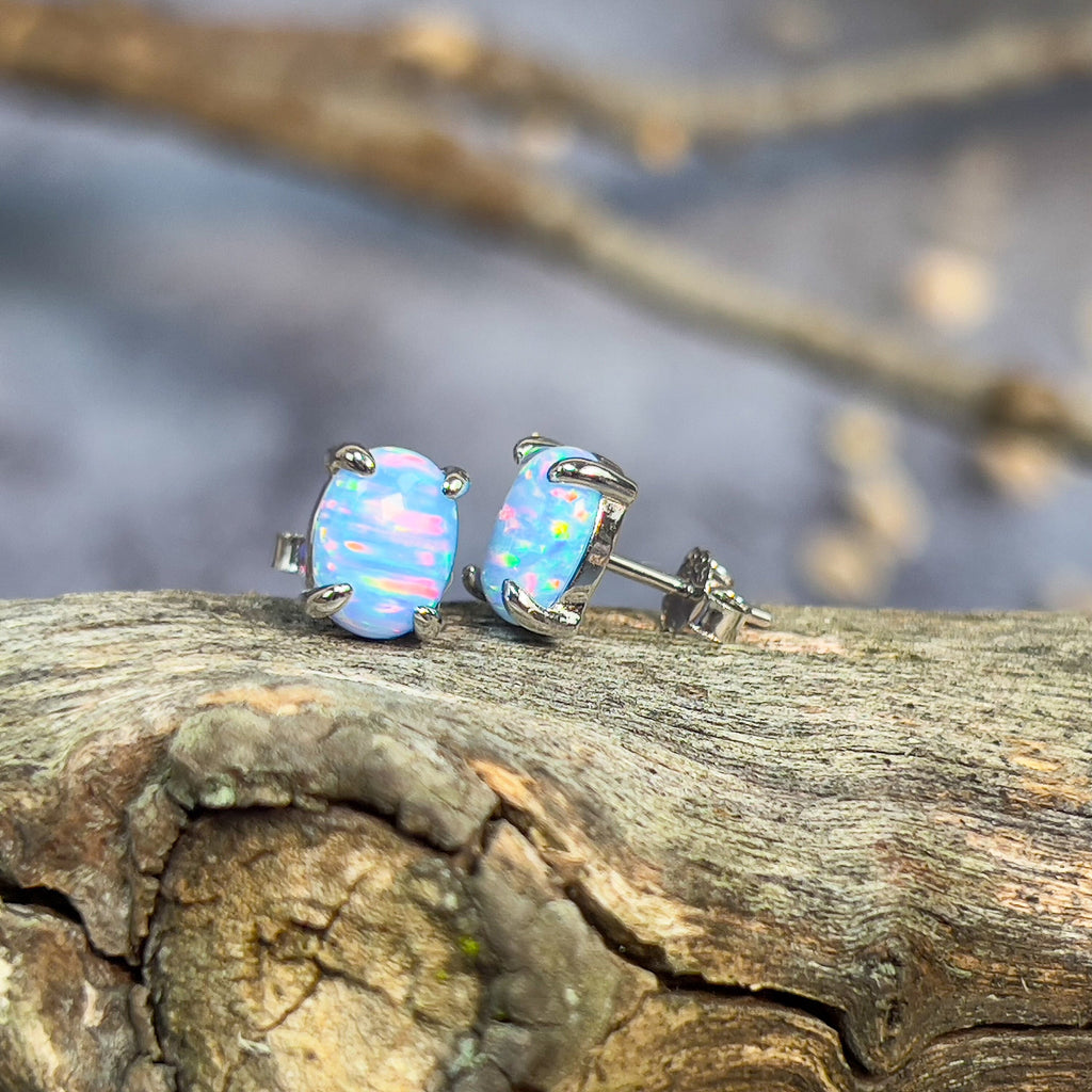 Heart's Art Australia- Play of Colour- Sterling Silver Created 8x6mm Solid Light Blue Red Opal stud earrings- Great Gift for everyday wear!