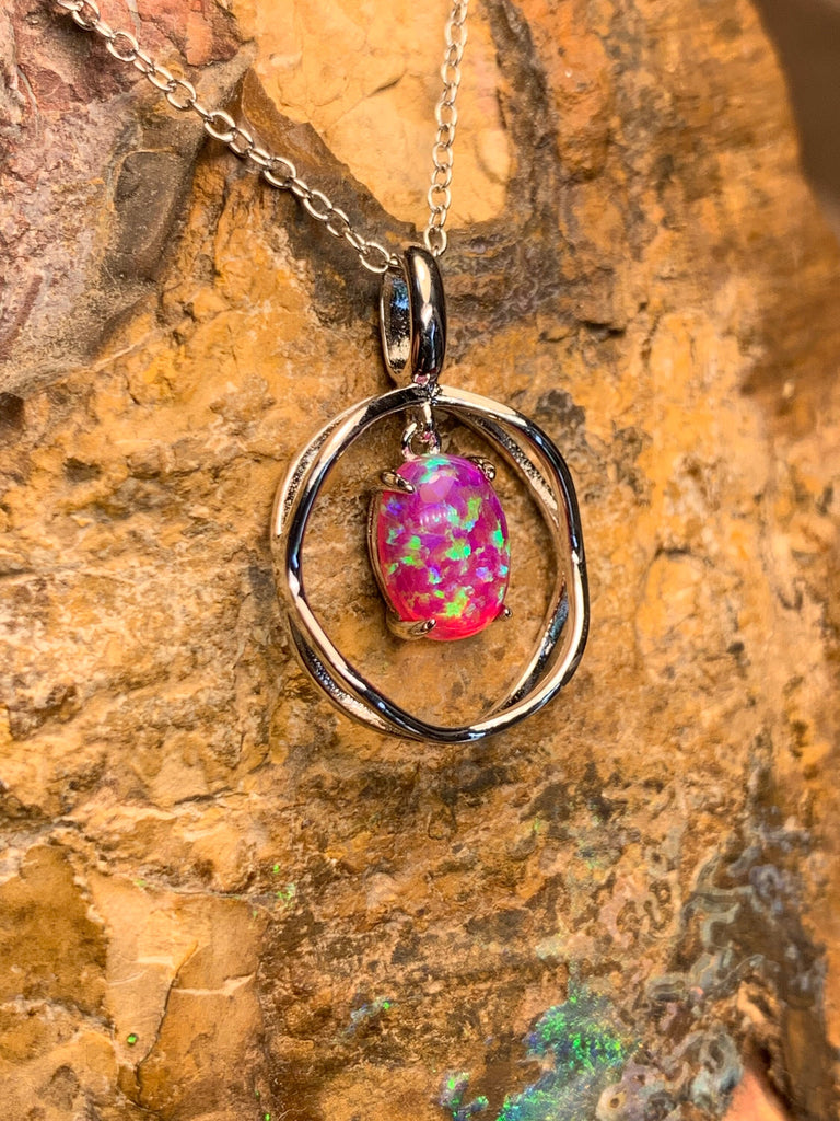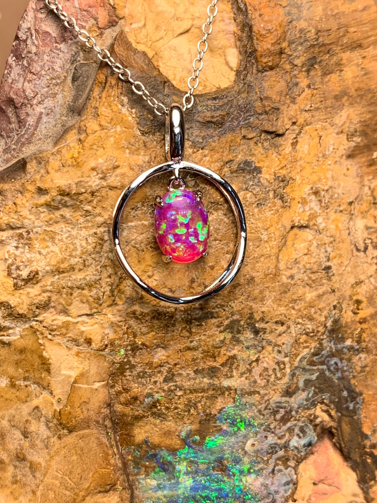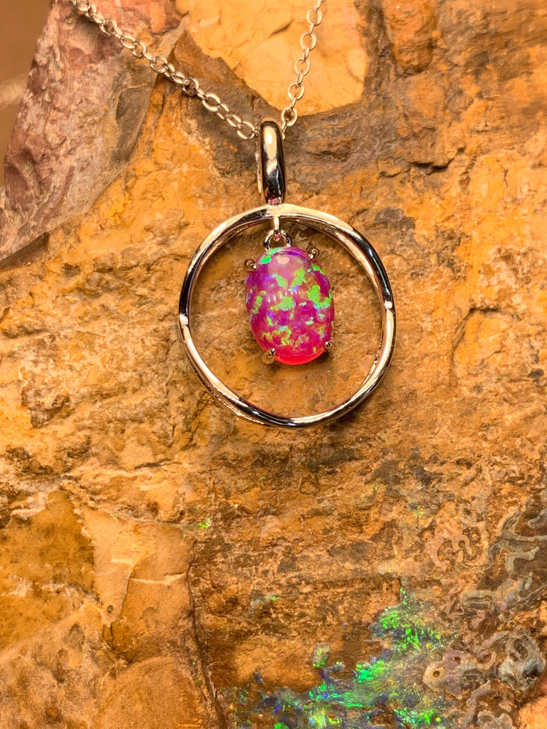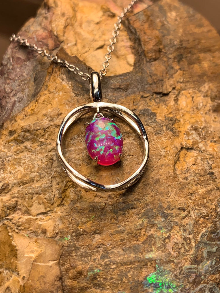 Heart's Art Australia- Play of Colour - Sterling Silver Created 8x6mm Solid Pink Opal with Green Fire bezel set pendant- Great Gift for Girl
