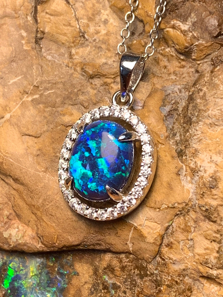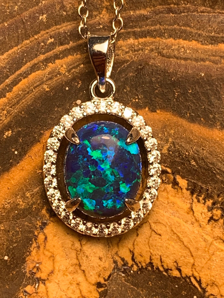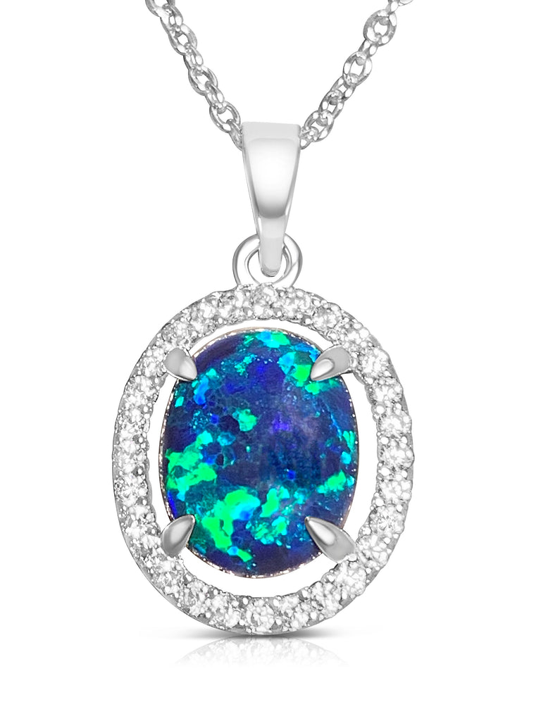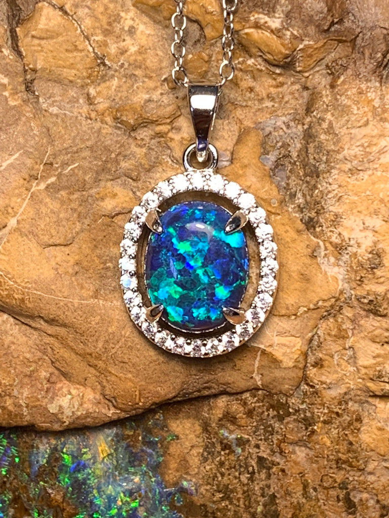 Heart's Art Australia- Play of Colour - Sterling Silver Halo cluster Created 10x8mm Solid Blue Green Opal pendant- Great Gift for women!