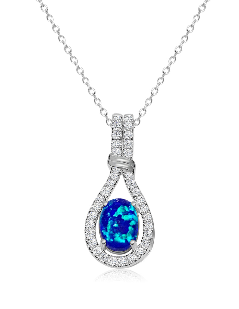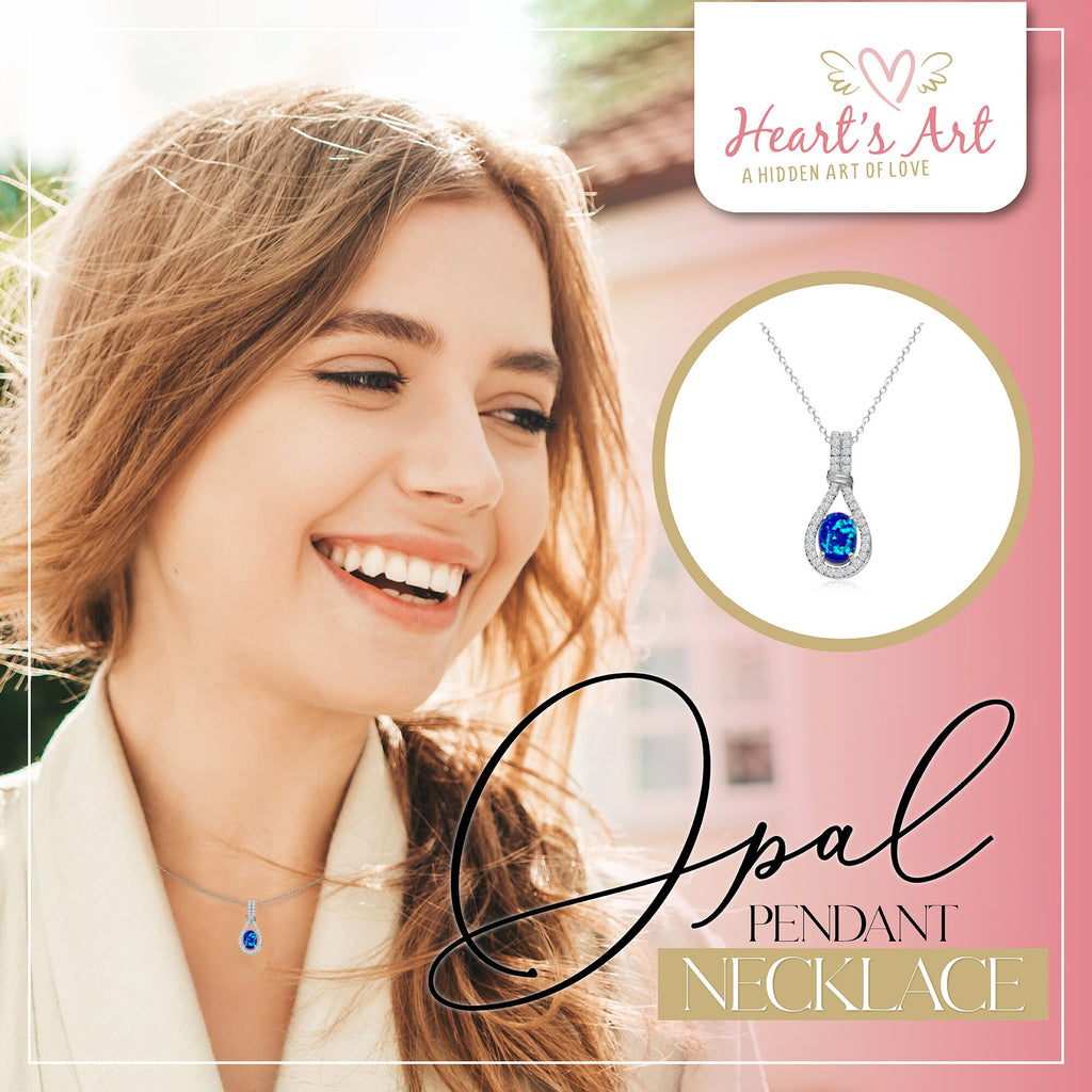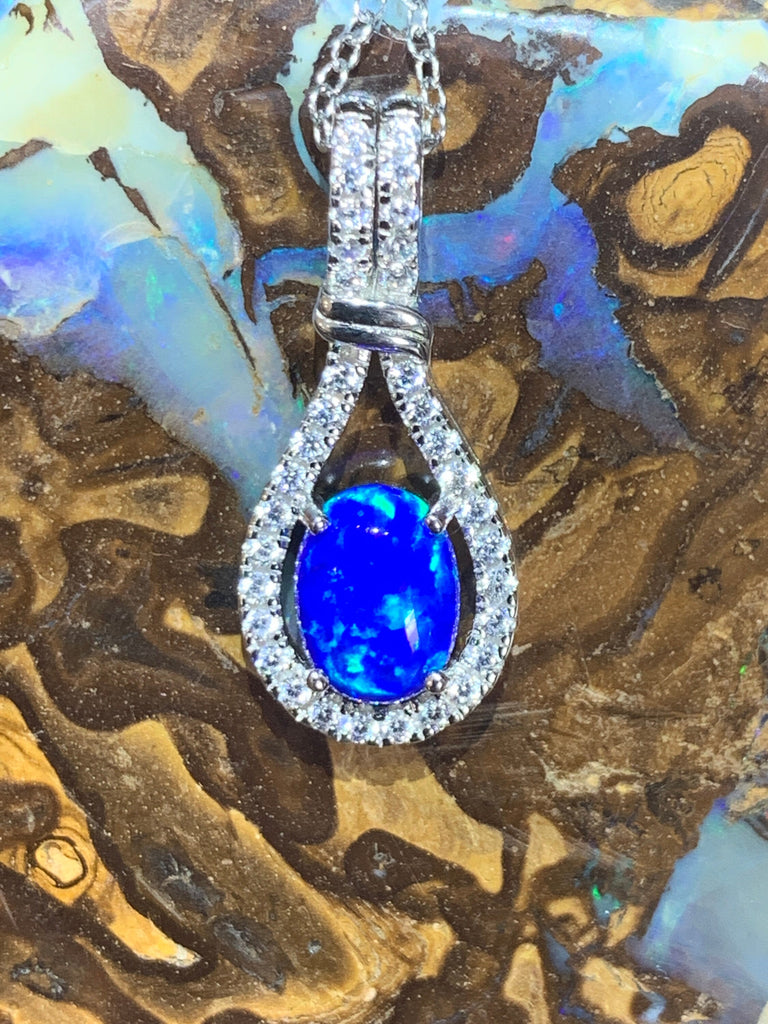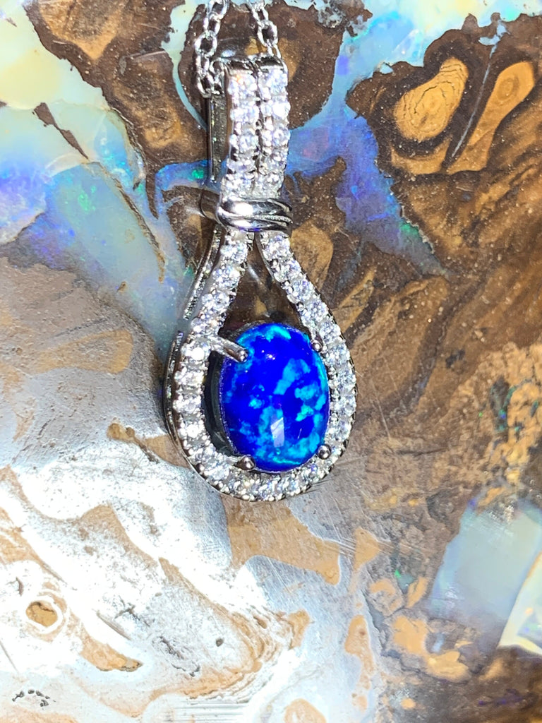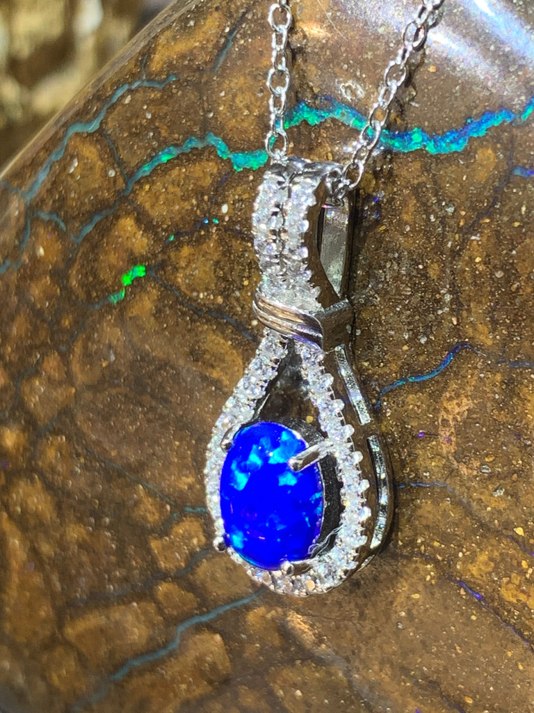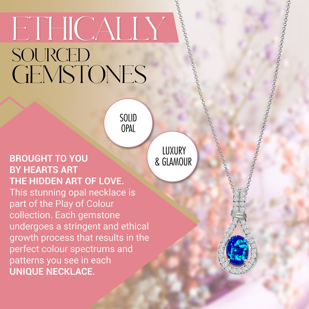 Heart's Art Australia- Play of Colour - Sterling Silver Halo cluster Created 8x6mm Solid Deep Blue Opal pendant- Great Gift for women!