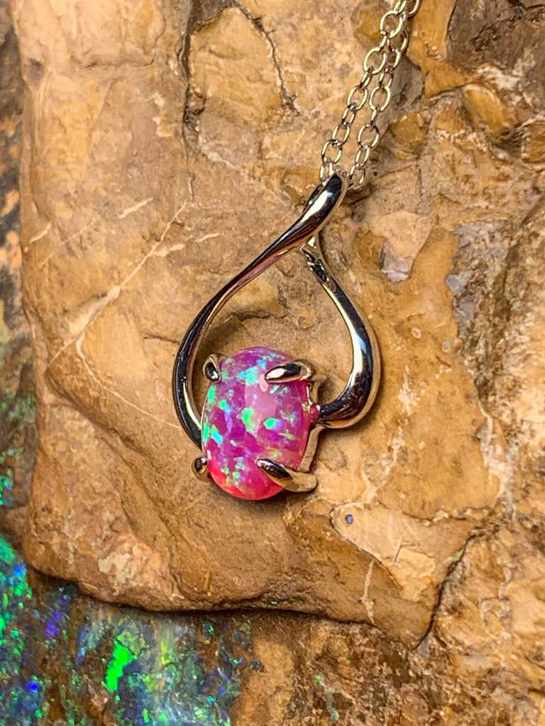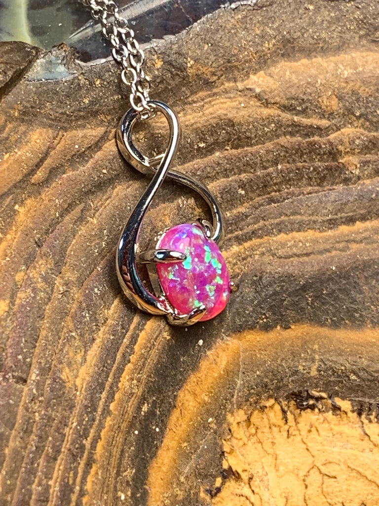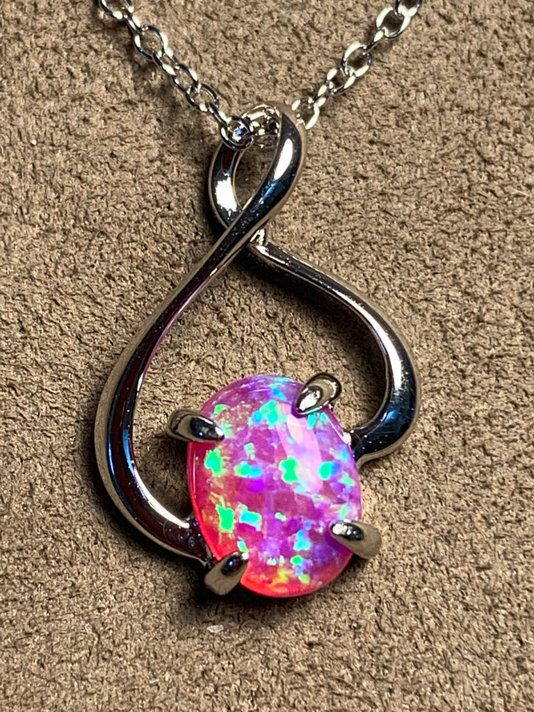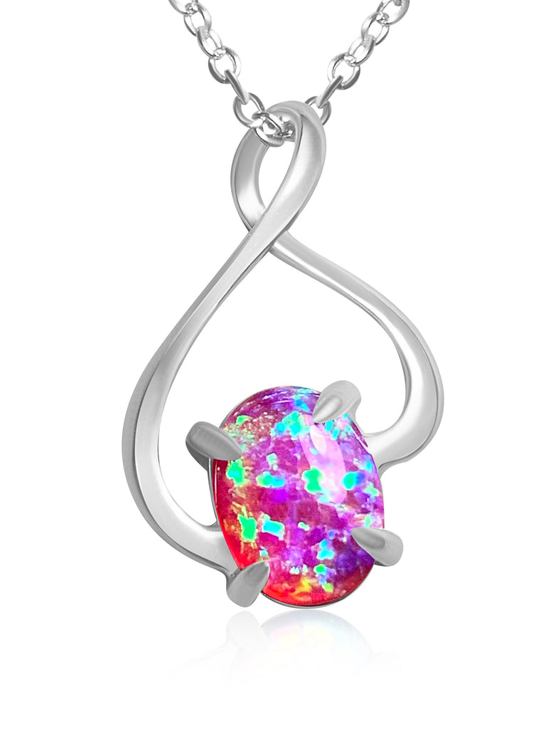 Heart's Art Australia-Play of Colour- Sterling Silver Infinity Loop Created 8x6mm Solid Green Pink Opal necklace- Great Gift for women!