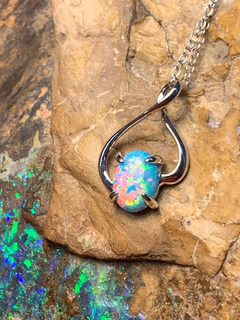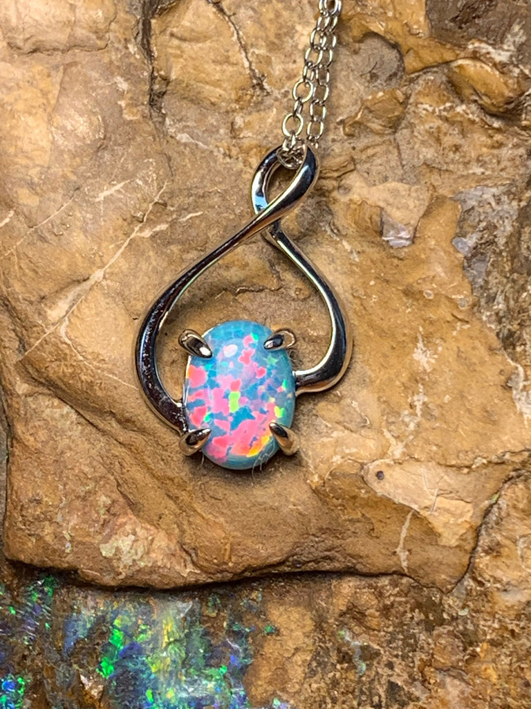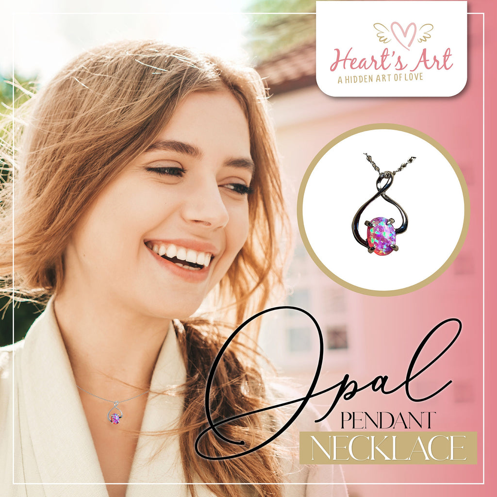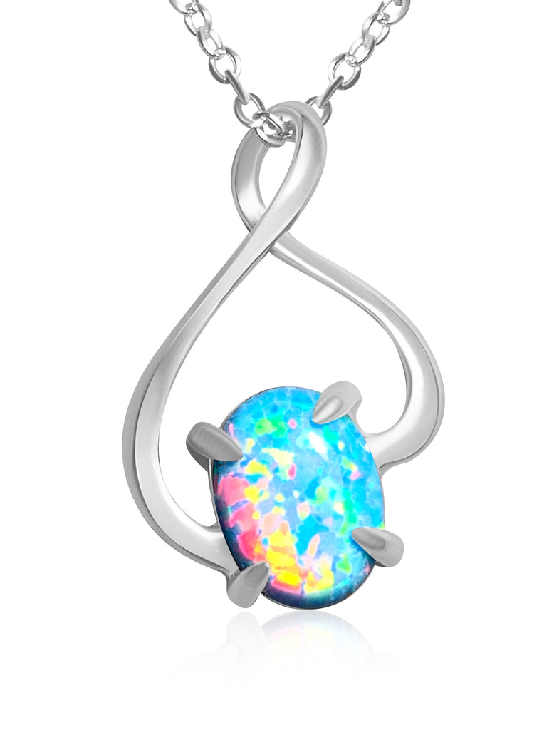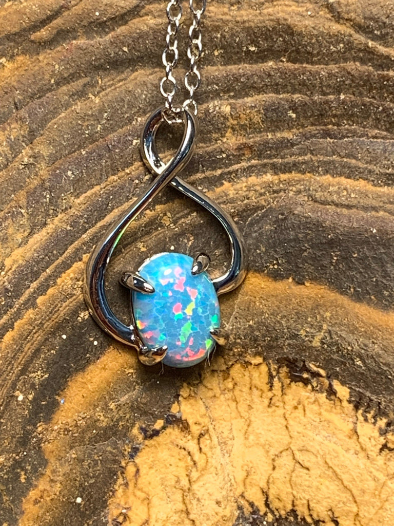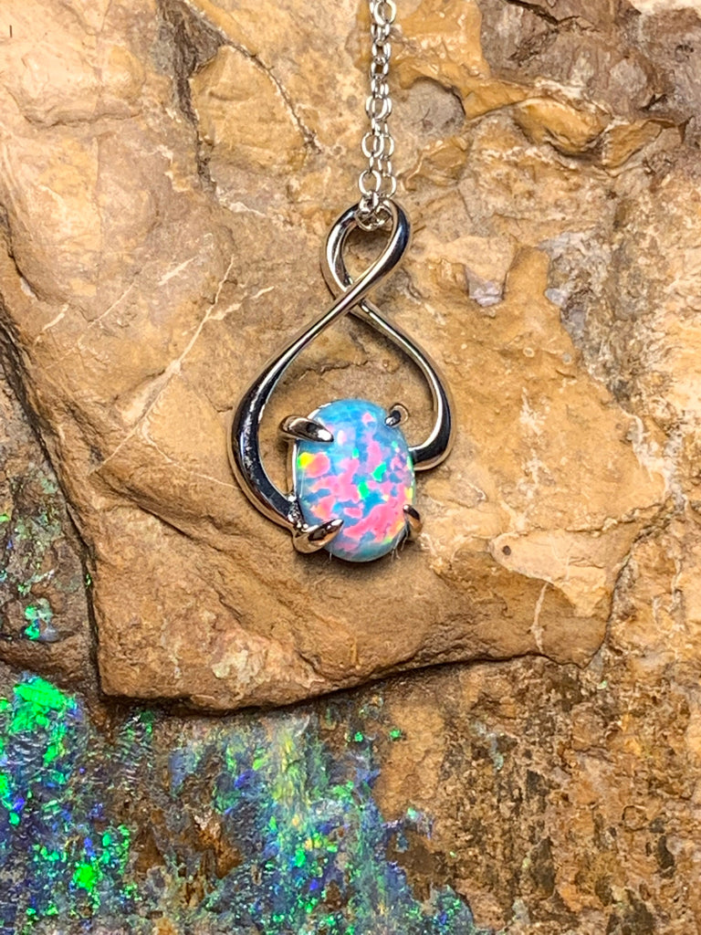 Heart's Art Australia-Play of Colour- Sterling Silver Infinity Loop Created 8x6mm Solid Green Yellow Red Opal necklace- Great Gift for women