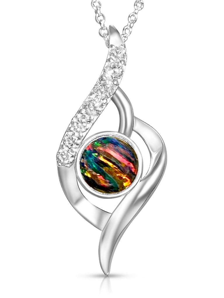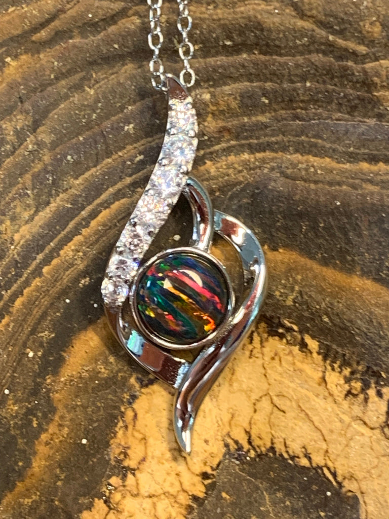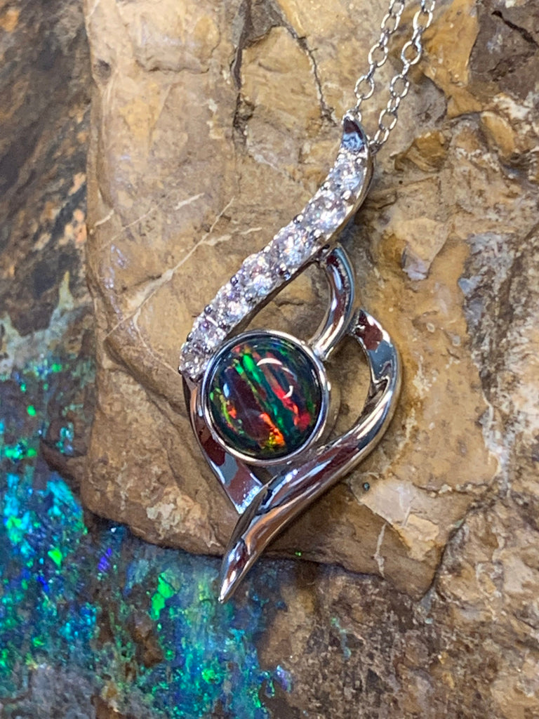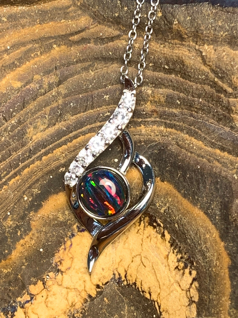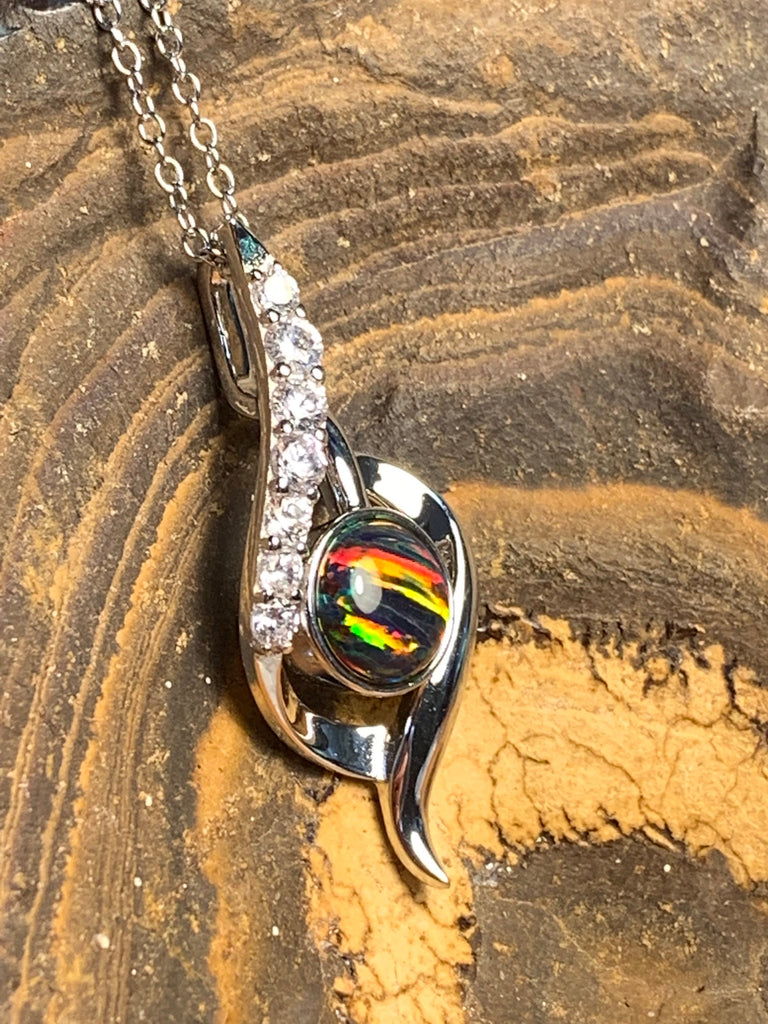 Heart's Art Australia-Play of Colour-Sterling Silver Necklace Modern Created 7mm Solid Black Green Fire Opal pendant- Perfect Gift for women
