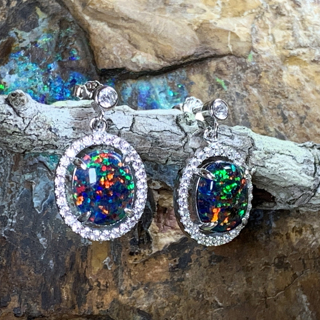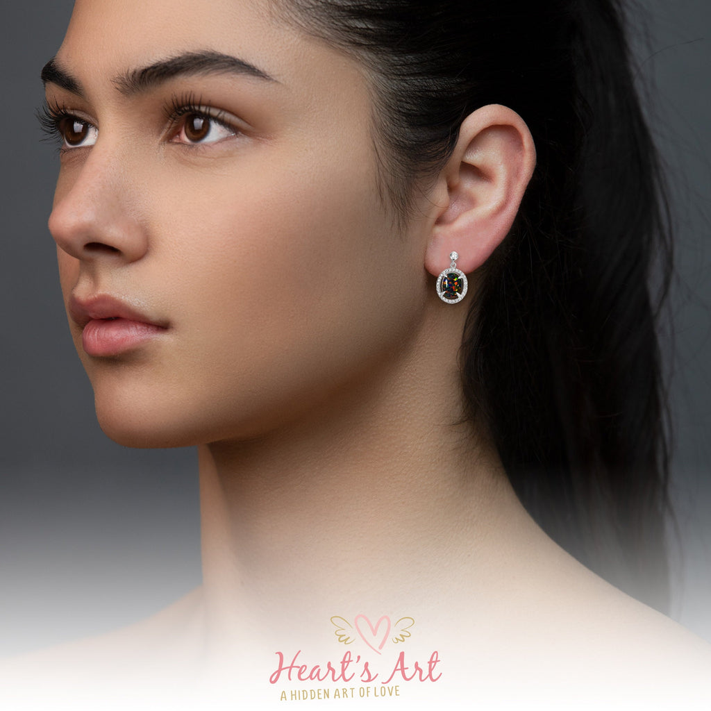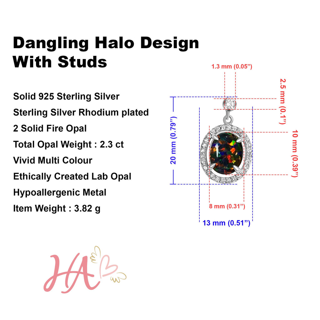 Heart's Art Australia- Sterling Silver Created 10x8mm Solid Black Fire Opal Halo dangling earrings- Great Gift for women