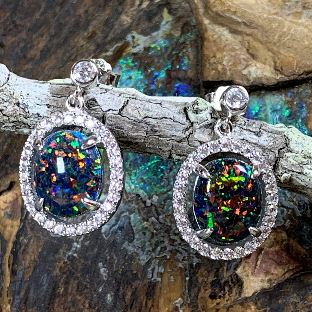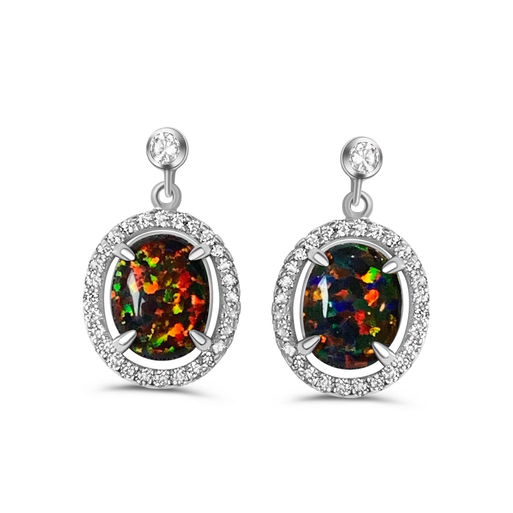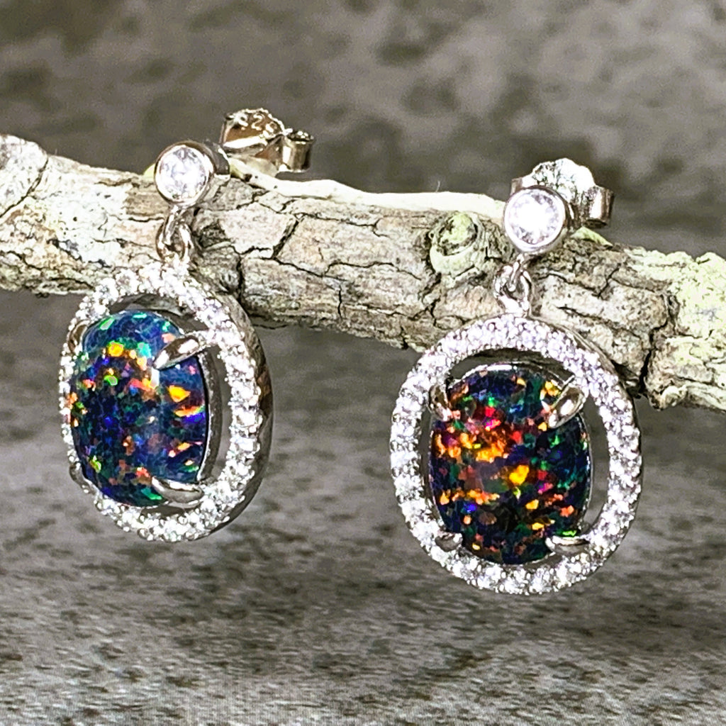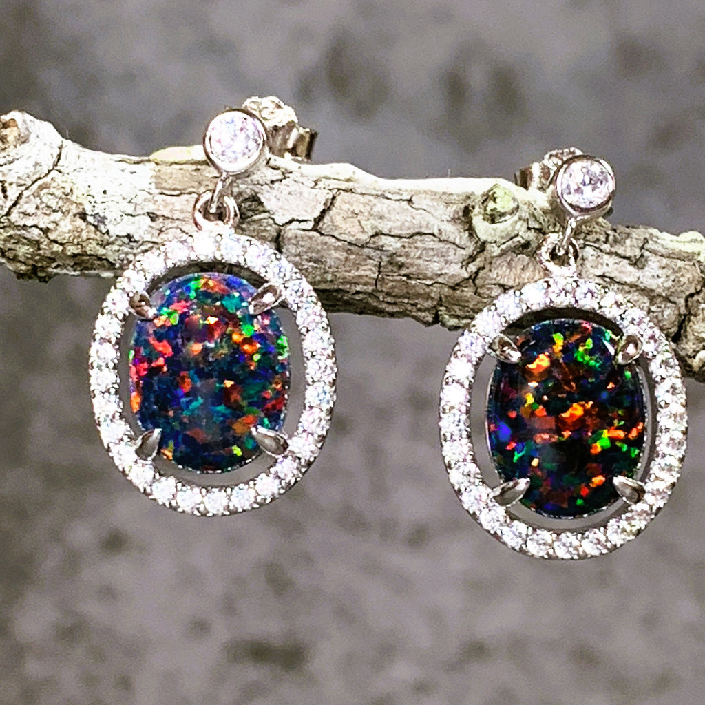 Heart's Art Australia- Sterling Silver Created 10x8mm Solid Black Fire Opal Halo dangling earrings- Great Gift for women