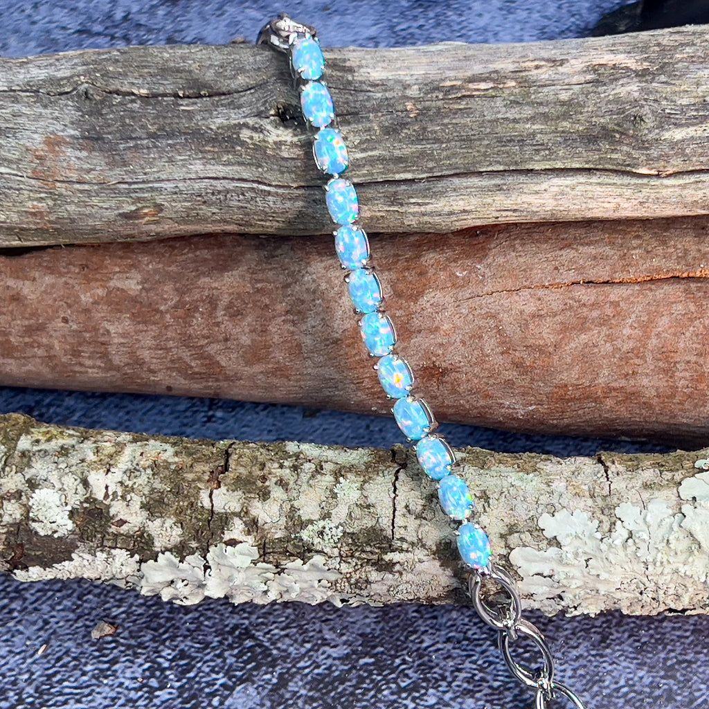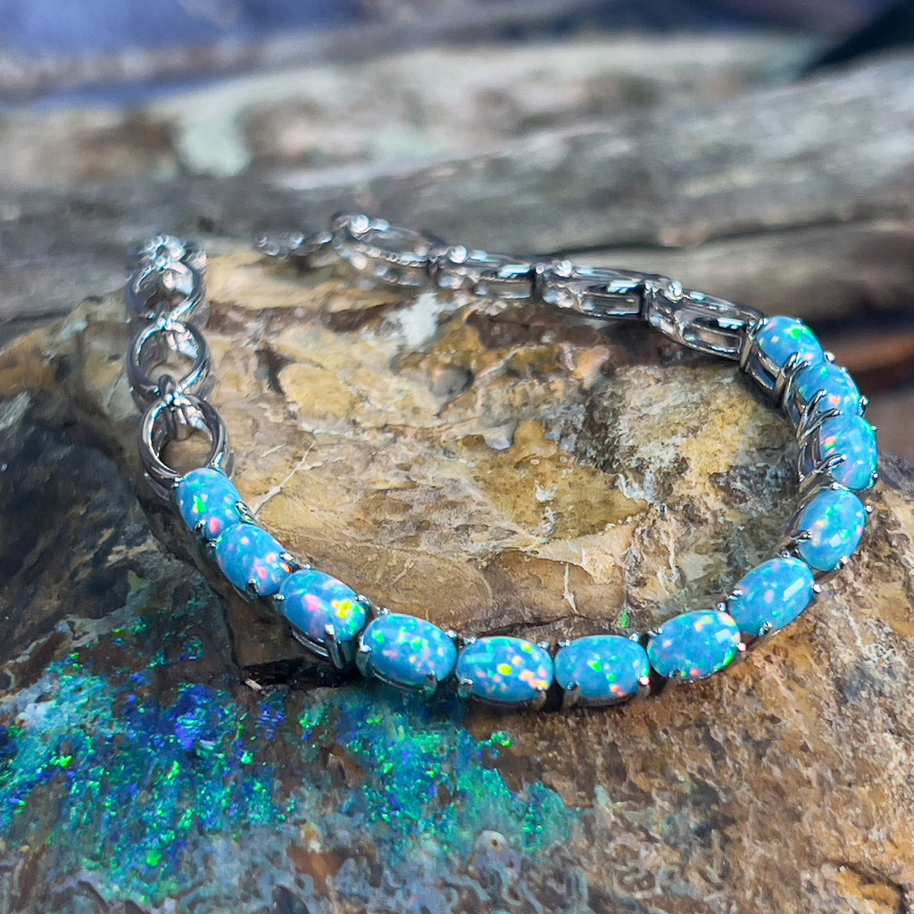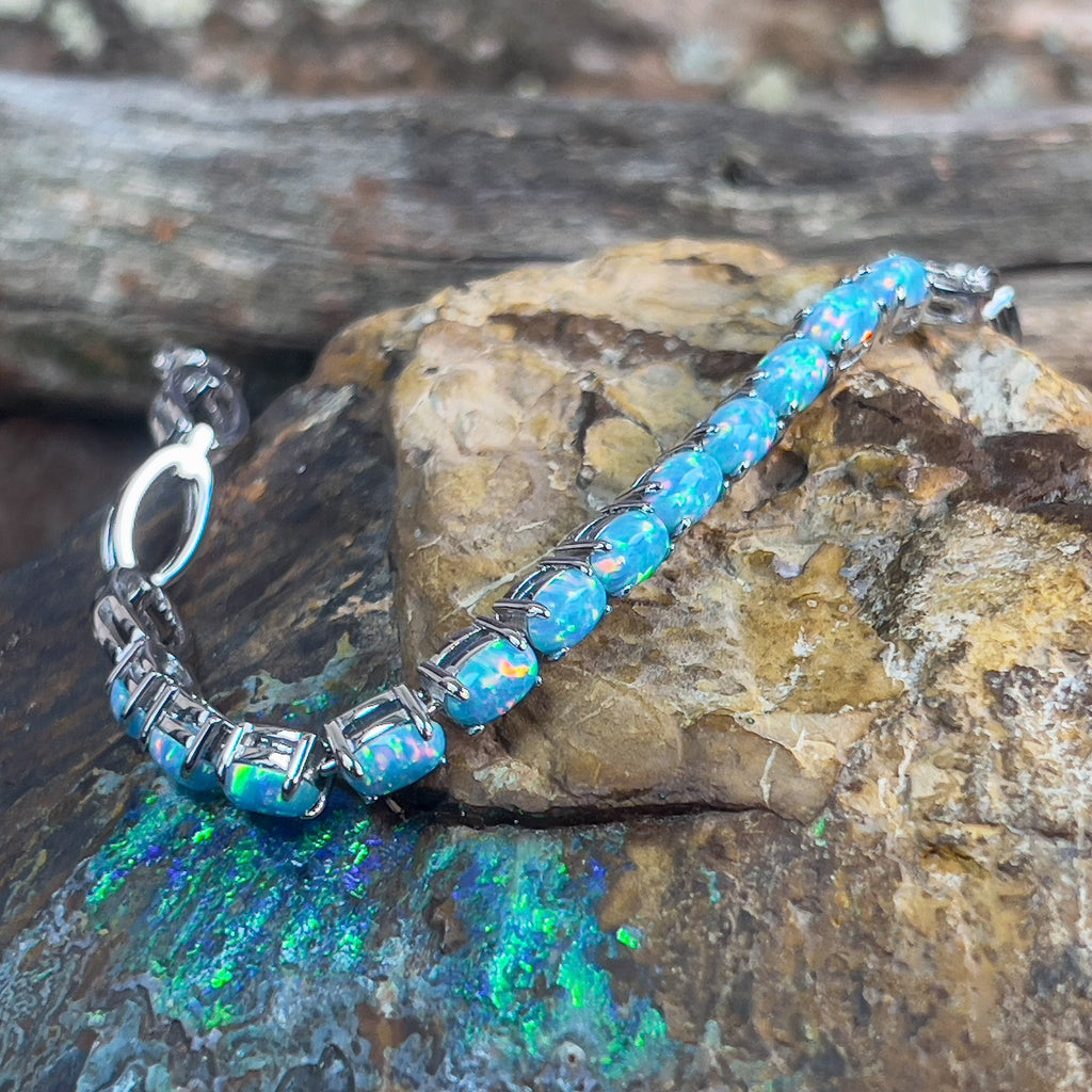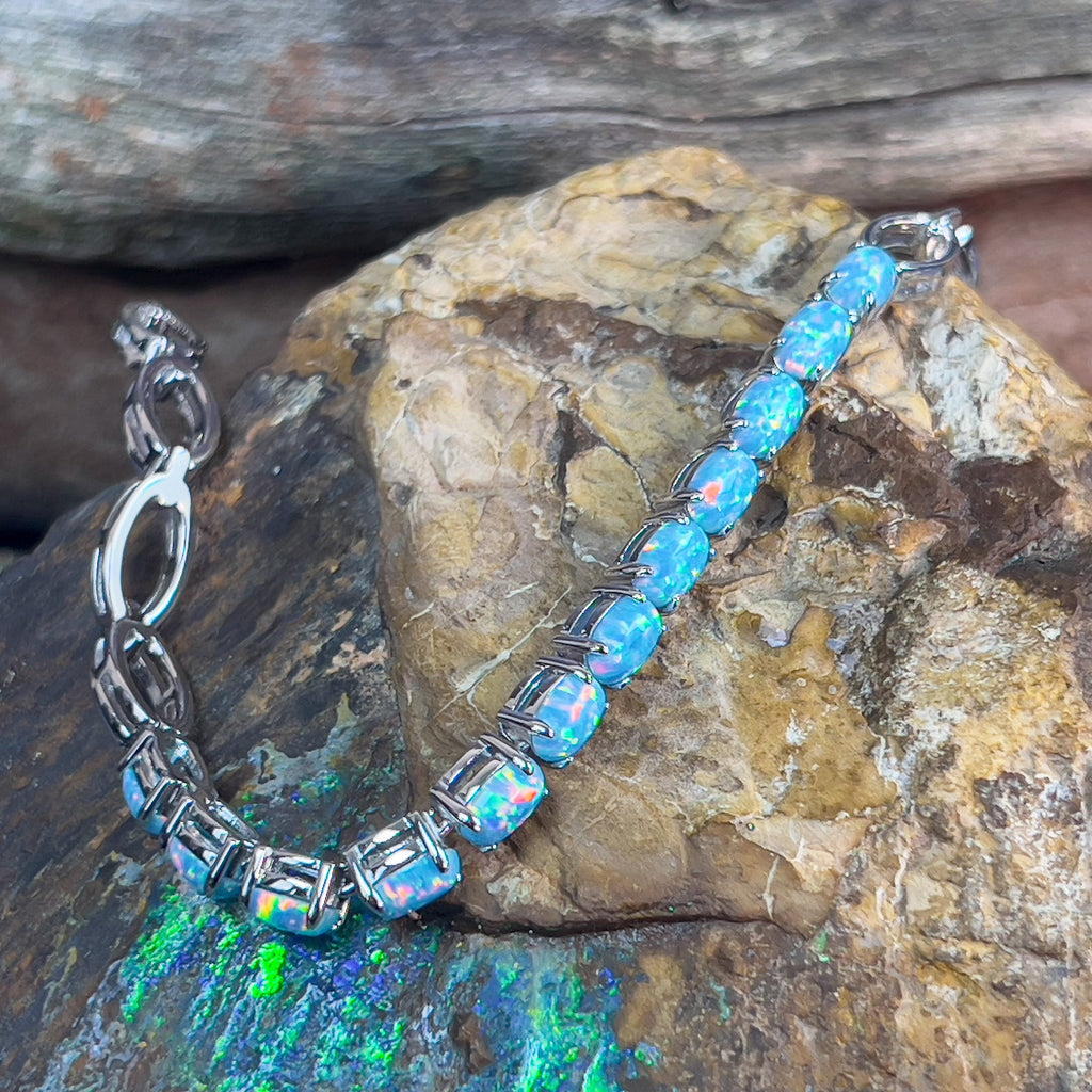 Heart's Art Australia- Sterling Silver Created 6x4mm Solid Multi Colour Turquoise Blue Red Opal claw set tennis bracelet- Great Gift