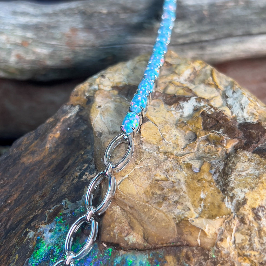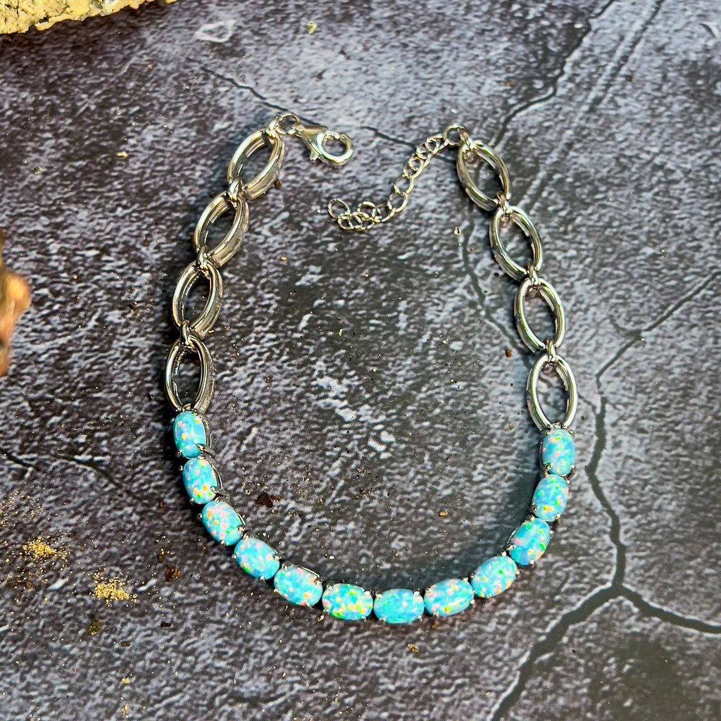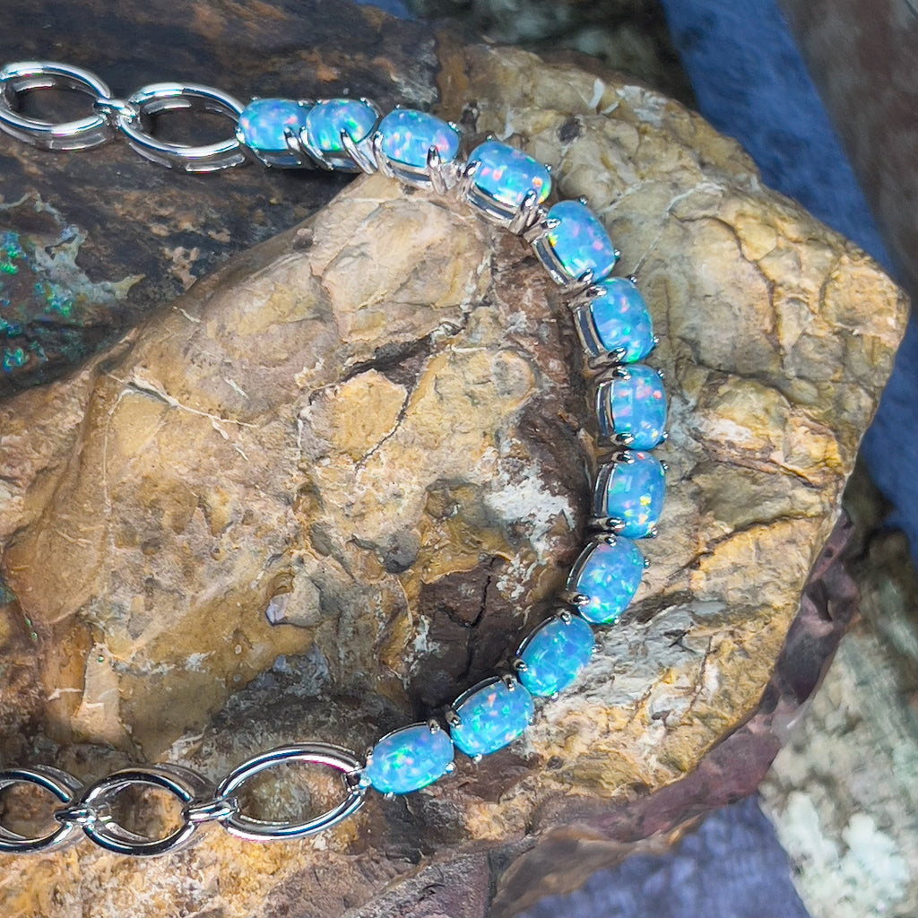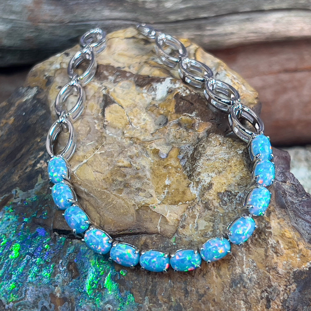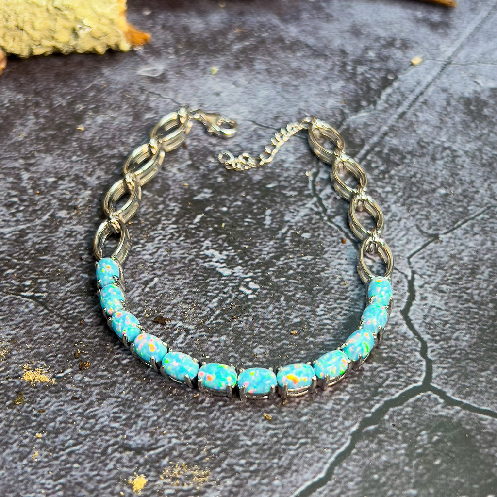 Heart's Art Australia- Sterling Silver Created 6x4mm Solid Multi Colour Turquoise Blue Red Opal claw set tennis bracelet- Great Gift